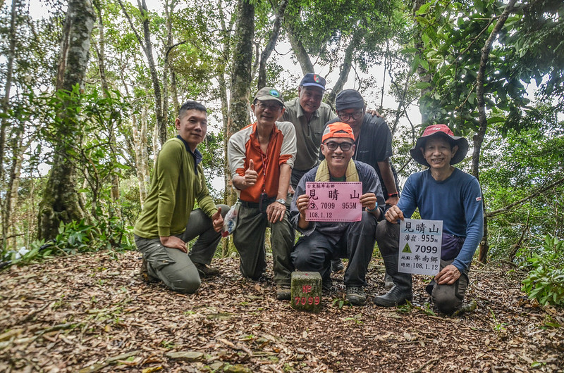 11:18 登頂見晴山,標高955公尺;平坦的山頭立有一顆編號7099號的三等三角點,座標246350 2510718,山頂西邊另有一條路徑通往加大奈山;