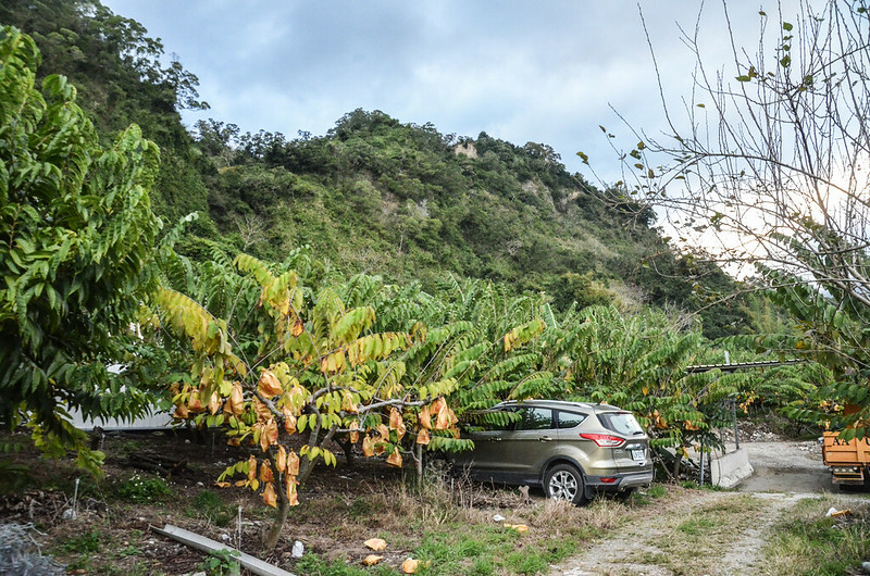然後續沿東38鄉道東北行640公尺後遇岔路左轉釋迦園間產道行約500公尺經過果園工寮在行150公尺路底停車,座標263466 2530042,海拔171公尺。