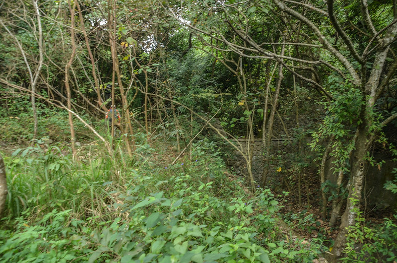 由停車處朝北沿不明顯的小徑進入有茅草的樹林,向正北緩上,儘量靠東側的乾溪溝走,走約100公尺遇到右側的攔沙壩;