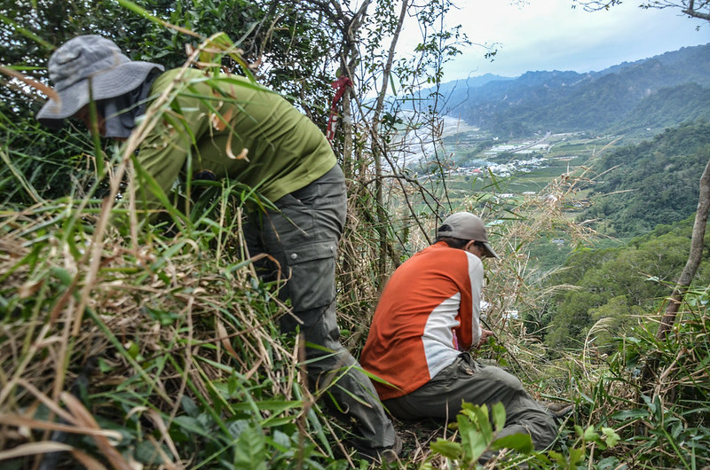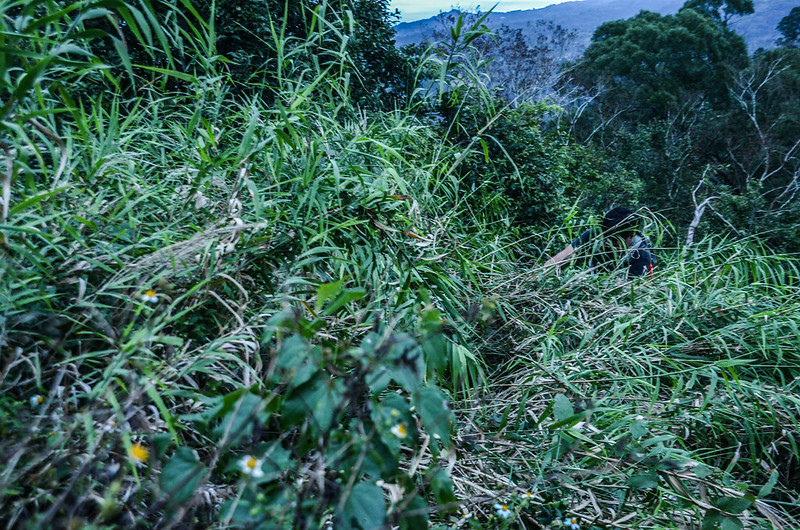 上到主稜後取右沿稜線朝東前進,不久越過一處難搞的長芒草山頭後下到一處小鞍;