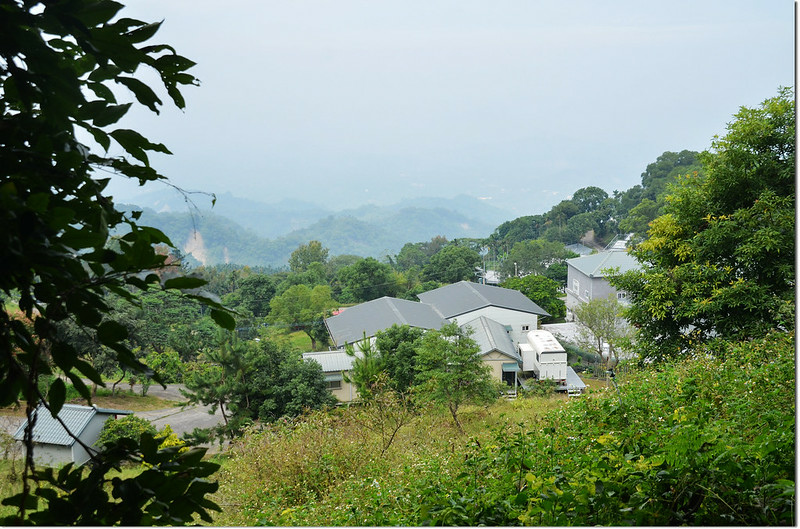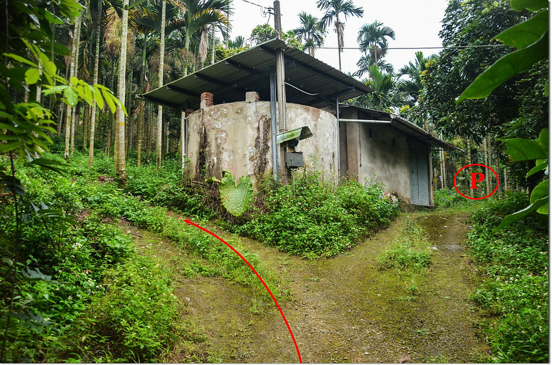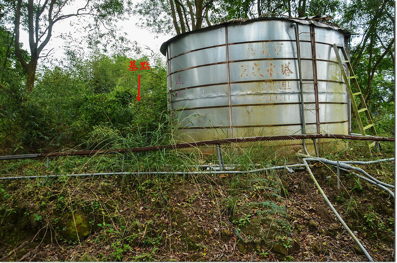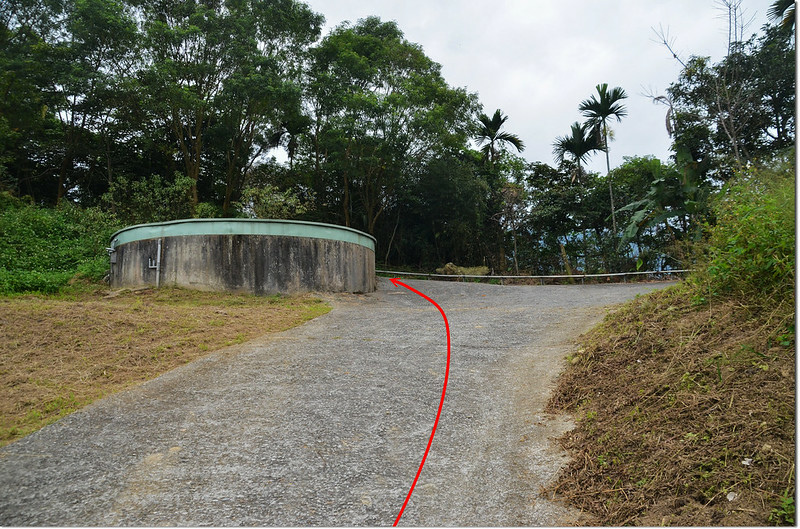 左行80公尺抵山頭,路右一座圓形白鐵蓄水槽;