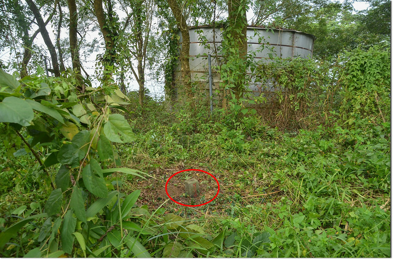 基點在蓄水槽東南邊4公尺的荒地上,中有鐵絲網隔離很難穿越,順著水泥產道往東下行約20公尺找到一處可跨越點越過鐵絲網回到蓄水槽東側,花了一些時間在長滿雜草、藤蔓的荒地上找到土地公山省政府圖跟補點,基點距蓄水槽約4公尺,基點旁有一棵小樹。