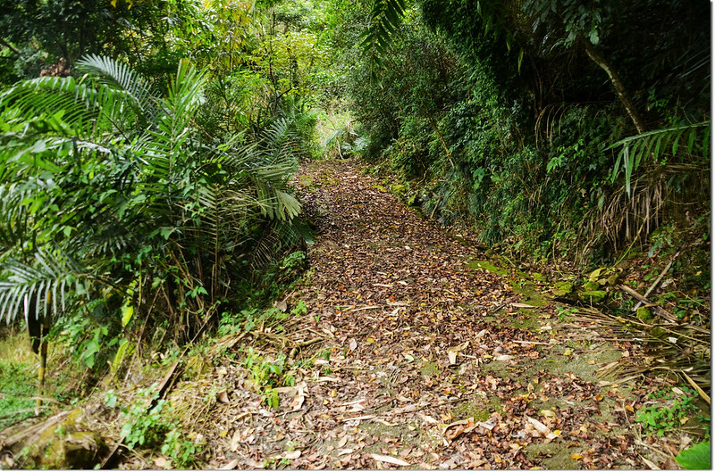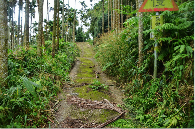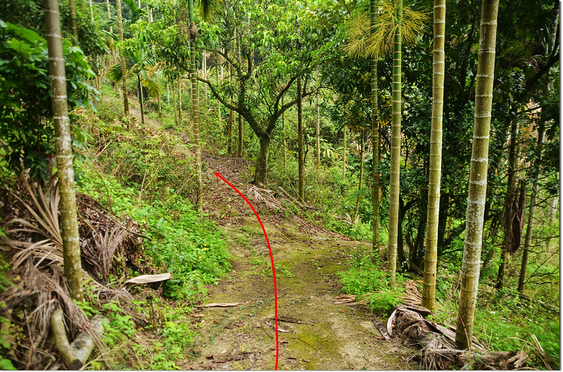行約60公尺接上水泥產道取右行上山,再行約70公尺岔路取右續上,產道再行80公尺於轉彎處取右岔長草土路緩下行;
