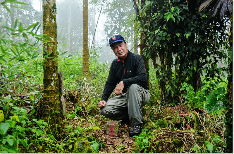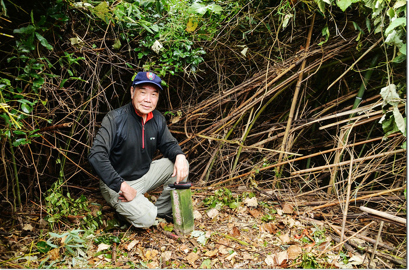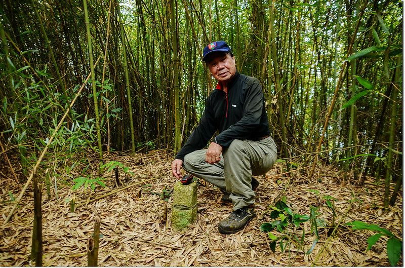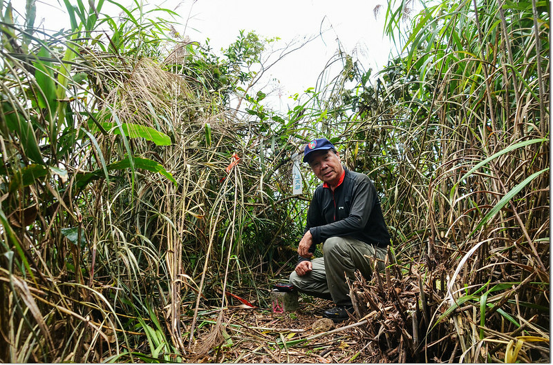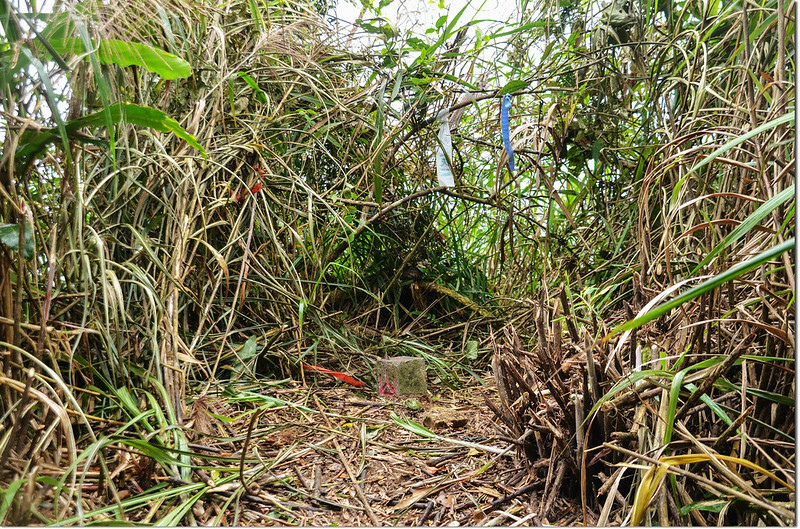 行約460公尺捨產道取右朝山頭陡上切,約90公尺抵分水嶺山頂,基石位在長菅芒草草叢及藤蔓中,小李兄與王哥已將草叢及藤蔓砍開,輕鬆入袋。