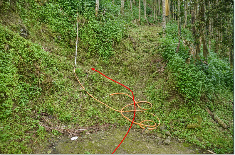0.3K 遇圓形水泥蓄水槽水泥產道右轉西南行,行20公尺左右隨即下坡