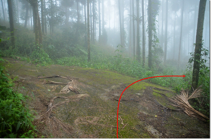 由停車處取產道主線繼續直上東南行,200公尺遇岔路取右岔,再行130公尺岔路仍取右行,右行300公尺後岔路仍取右上,行約80公尺抵稜線鞍部,右切入雜木、竹林沿稜線砍路上行,行約60公尺抵山頂基點處,小李兄、王哥剛來過,看現場場景如不是他們先來,靠我一人很難清理現場!