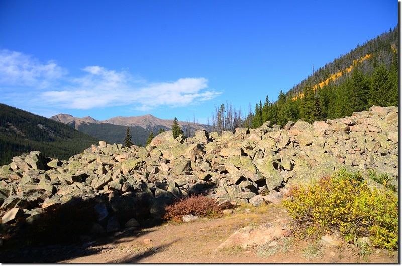 10:20 經一小段陡坡後抵一平緩地形,左側又是一片岩石區,北望山谷頂端幾座高山;此處海拔10,925呎/3,330公尺,距登山口約0.8哩;