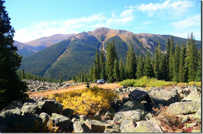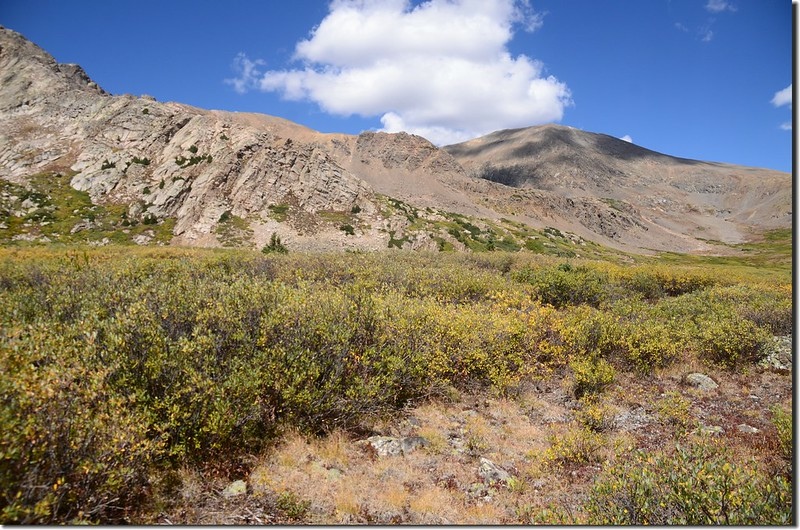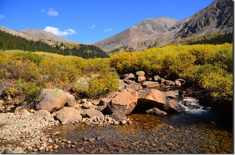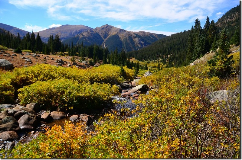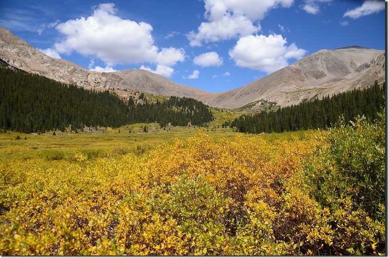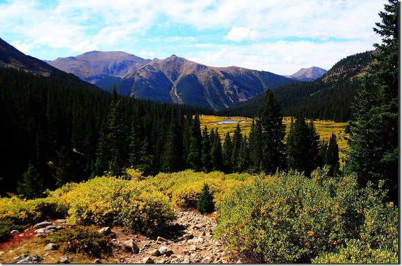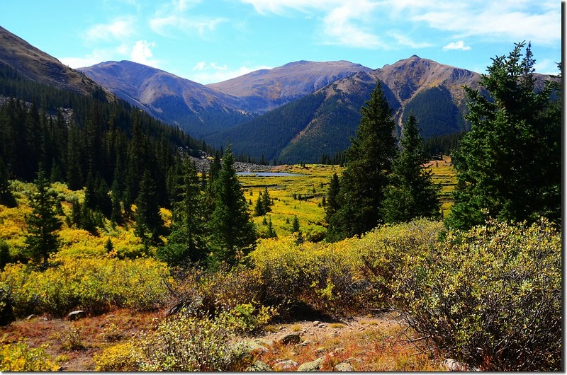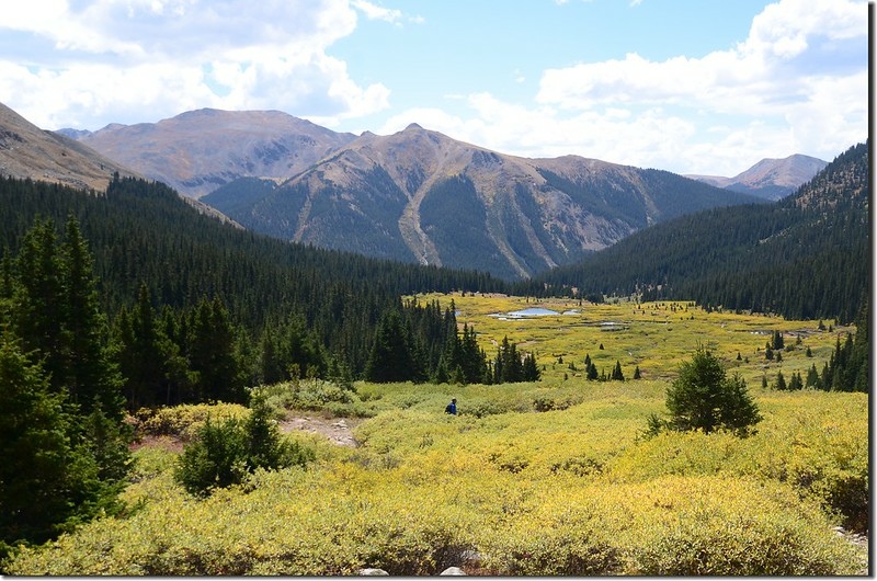 此後吉普車道即在Chihuahua Gulch西側北行,右側俯瞰美麗的山谷及背後高山,山谷中葉子已轉黃的willow灌木叢中幾處小塘益顯迷你美麗!