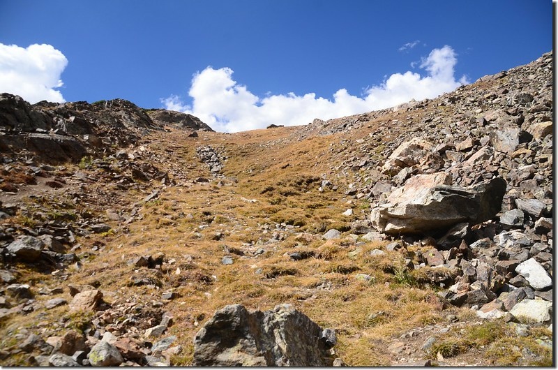 11:32 抵達Chihuahua Lake最後陡攀路段,小徑是在岩石坡間陡升,不太好走;此處海拔約11,982呎/3,612公尺,距登山口約3.4哩。