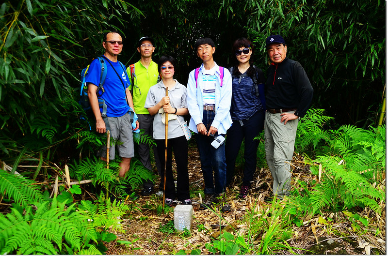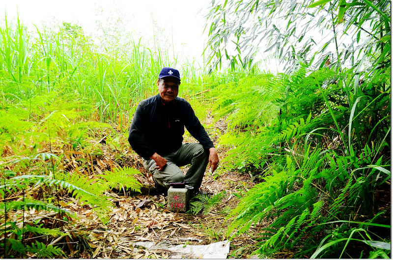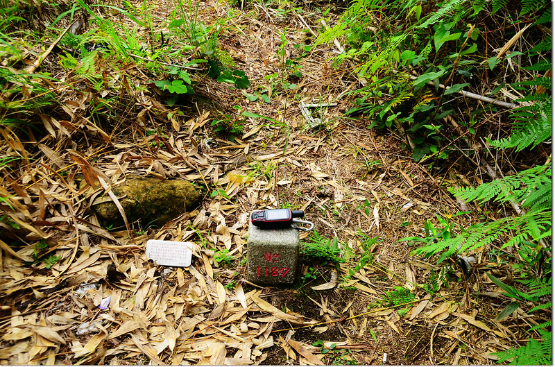 11:55 抵達頂笨子山山頂,此山為第二次攀登,編號1187號的二等三角點位在竹林外側靠進崖邊的芒草叢邊,基點南邊有一片約十公尺見方的空地,上次看到的竹編地舖已腐朽不見。