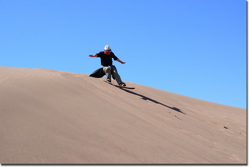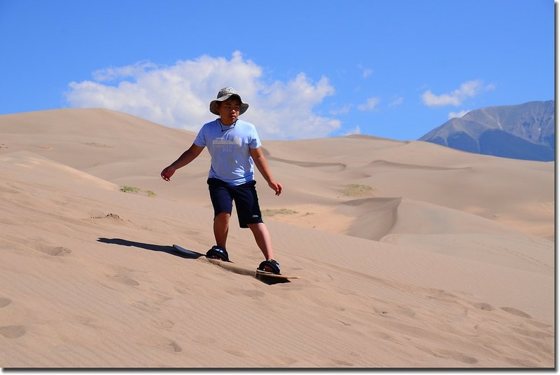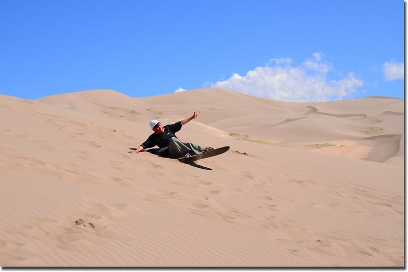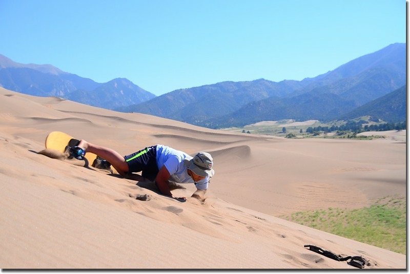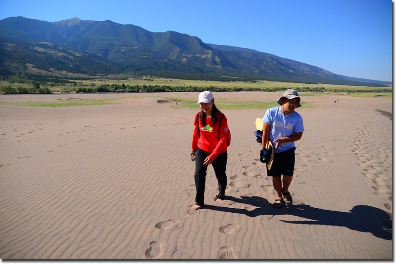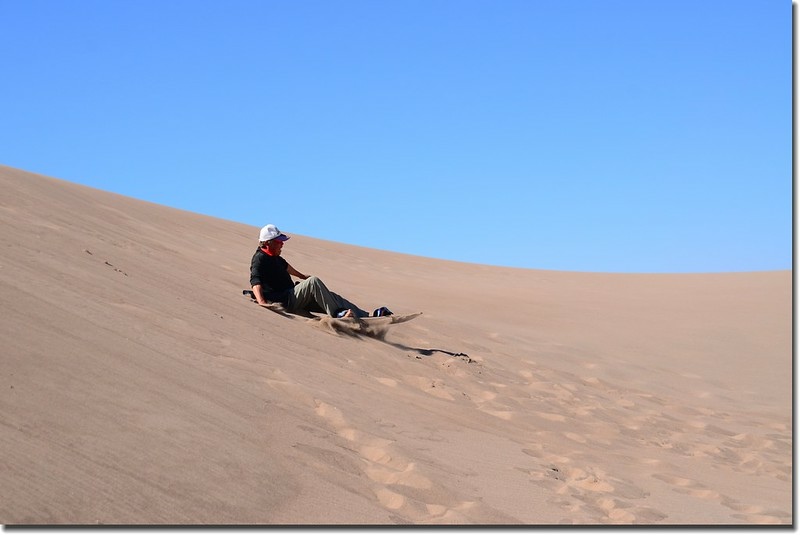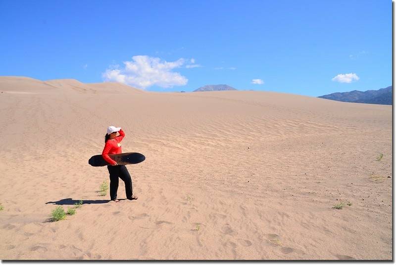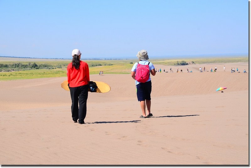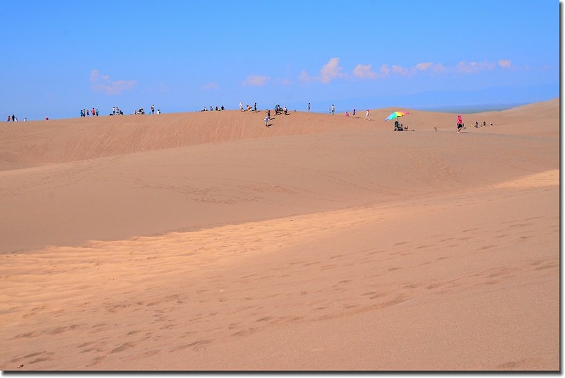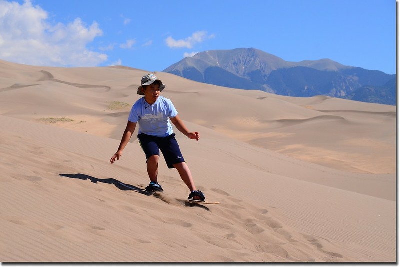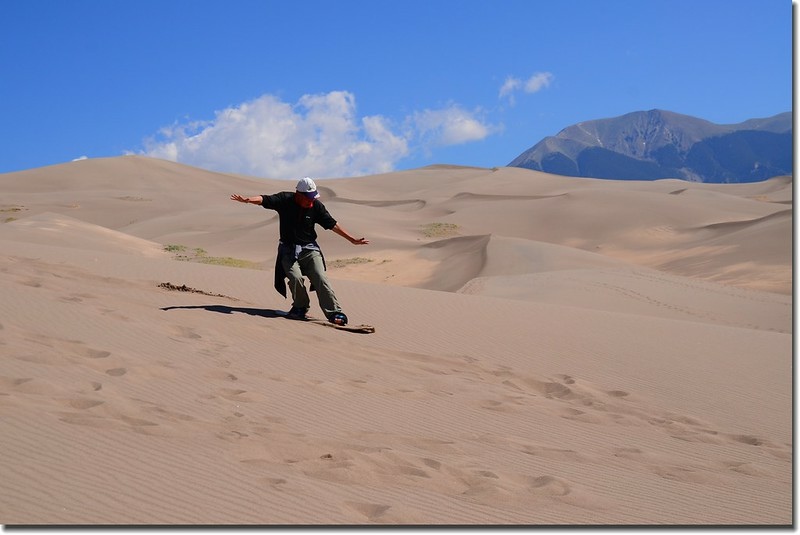 遊覽Great Sand Dunes除了欣賞日出、日落時沙丘炫爛的色彩及變幻萬千的光影外,白天就是登山健行和滑沙了;根據公園管理處發行的資料該公園登山健行有兩處高點可Hiking,東邊的高點稱為High Dune,高出沙丘底部650呎(198公尺);西邊的高點是Star Dune,高出沙丘底部750呎(229公尺),Star Dune是園區內的最高點,該兩處路線我於上次來遊覽時已爬過,總里程約三哩,總爬升高度約1,000呎(305公尺),共花了兩個多小時的時間。