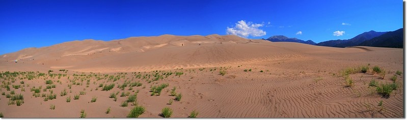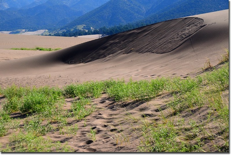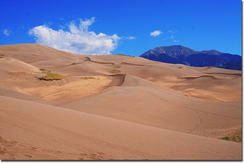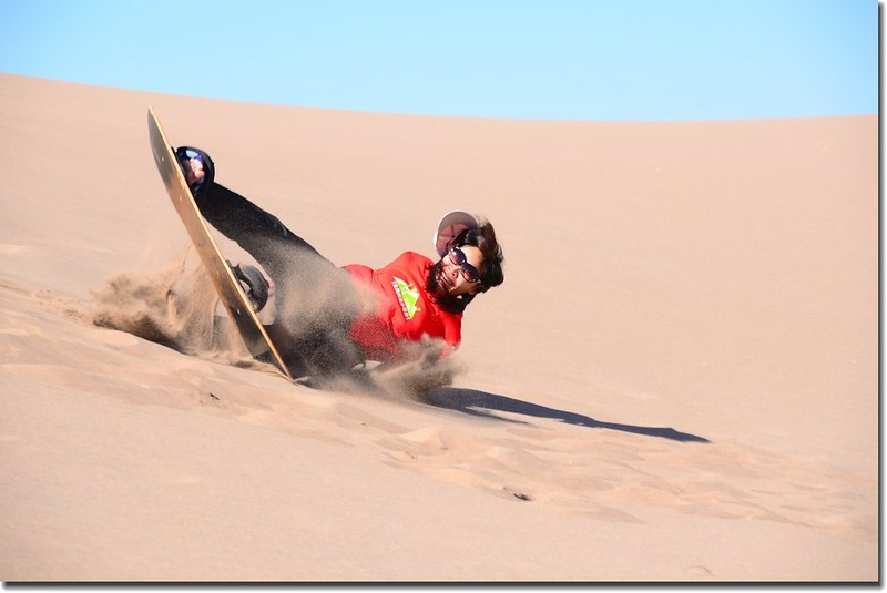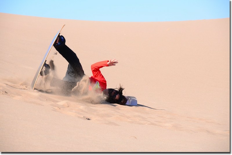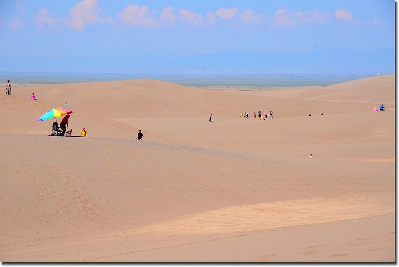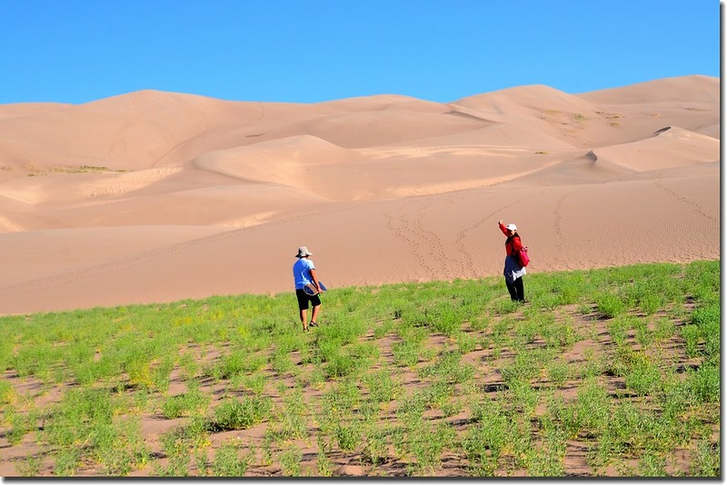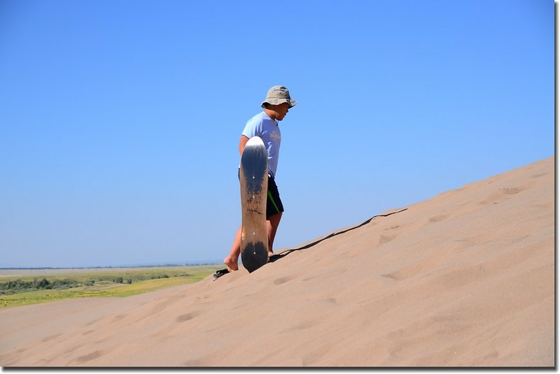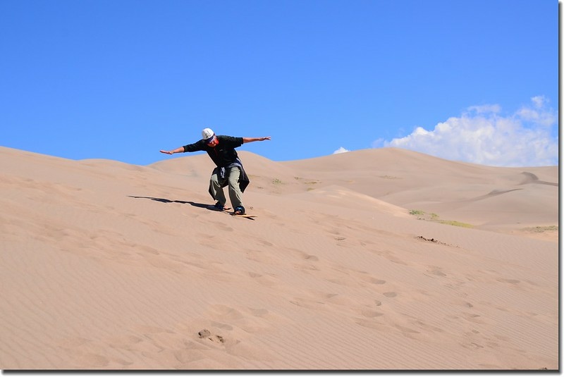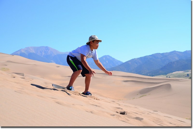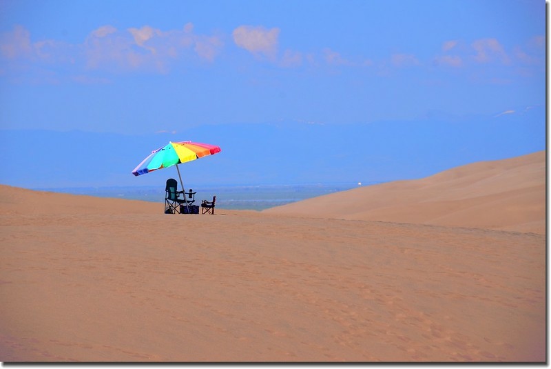 遊覽Great Sand Dunes除了欣賞日出、日落時沙丘炫爛的色彩及變幻萬千的光影外,白天就是登山健行和滑沙了;根據公園管理處發行的資料該公園登山健行有兩處高點可Hiking,東邊的高點稱為High Dune,高出沙丘底部650呎(198公尺);西邊的高點是Star Dune,高出沙丘底部750呎(229公尺),Star Dune是園區內的最高點,該兩處路線我於上次來遊覽時已爬過,總里程約三哩,總爬升高度約1,000呎(305公尺),共花了兩個多小時的時間。