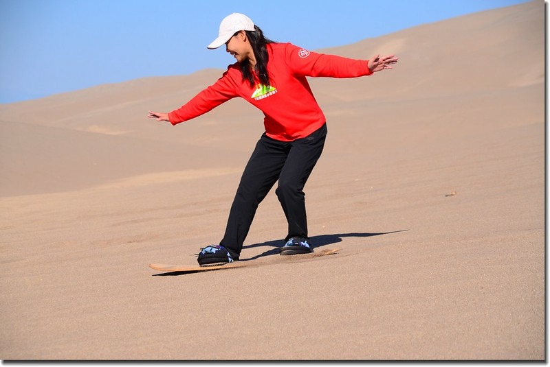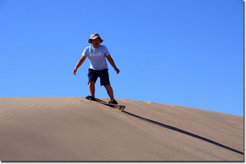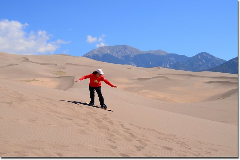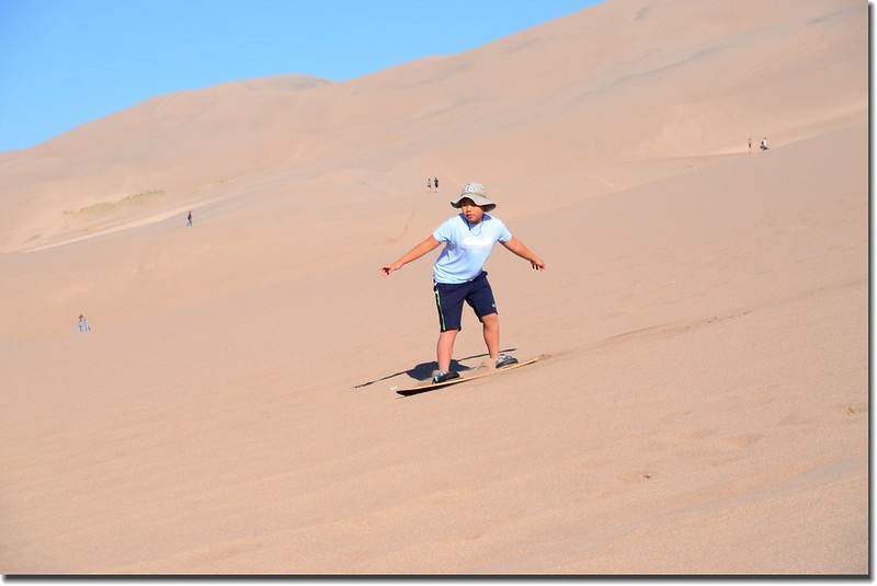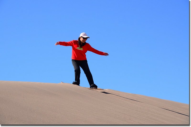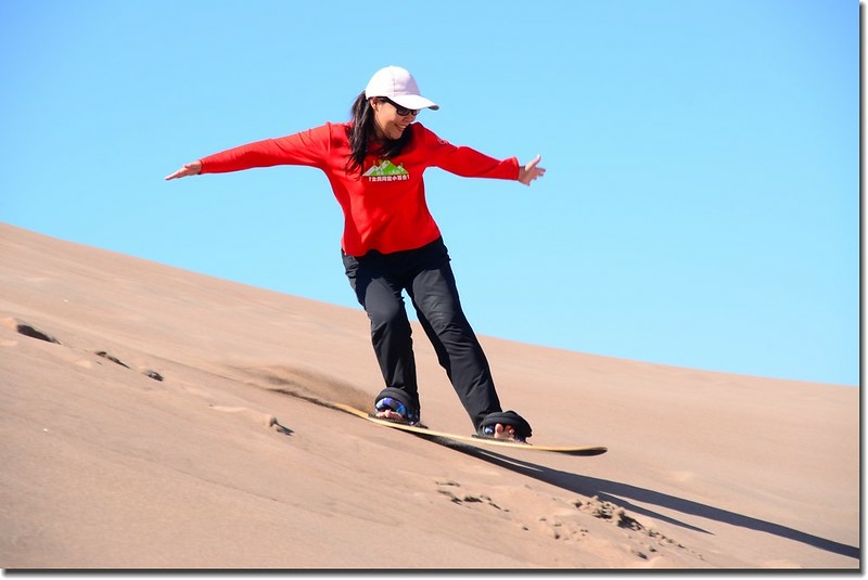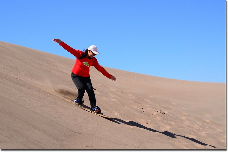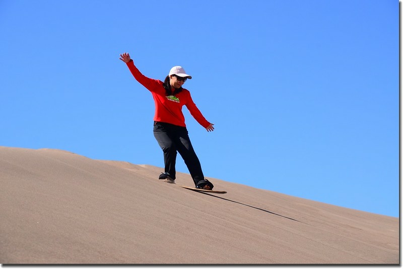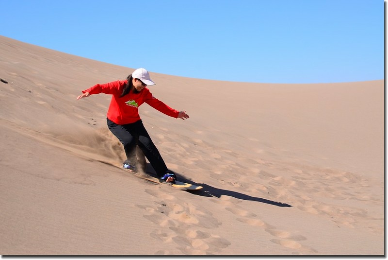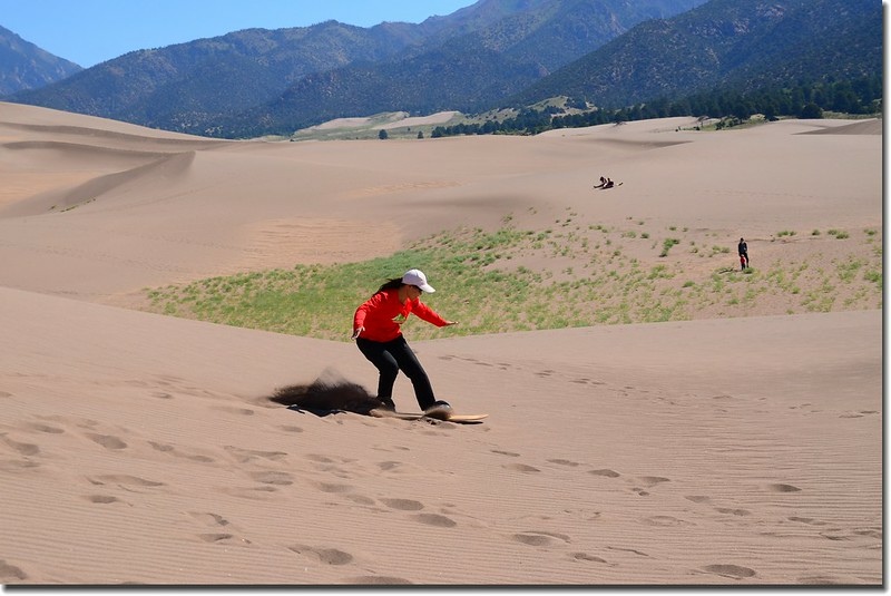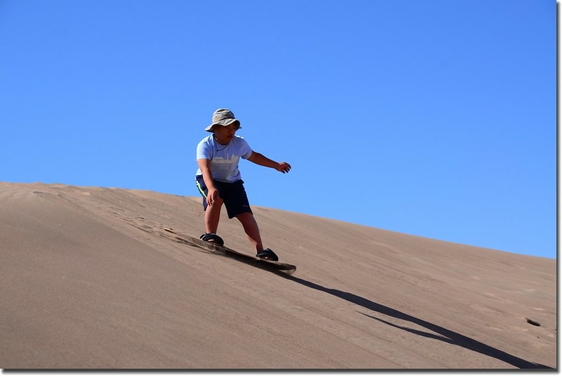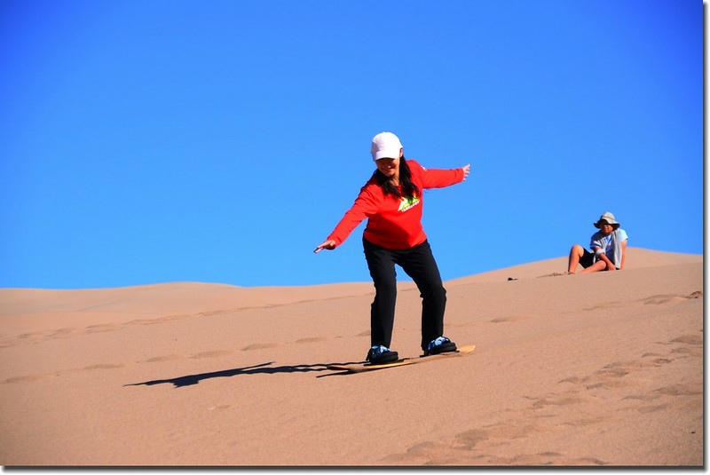 此趟小女兒主要目的是滑沙,所以沒健行;早上欣賞完了日出後大女兒載小女兒到遊客中心外頭約3.5哩CO 150公路邊的Great Sand Dunes Oasis租借滑沙板,一個滑沙板一天20美元,不算便宜,但為了體驗滑沙的樂趣,我們租了一個滑沙板祖孫們輪流體驗,兩個小時下來比健行還累,不過這錢花得也值得!