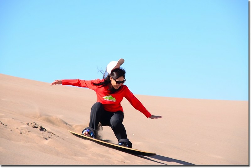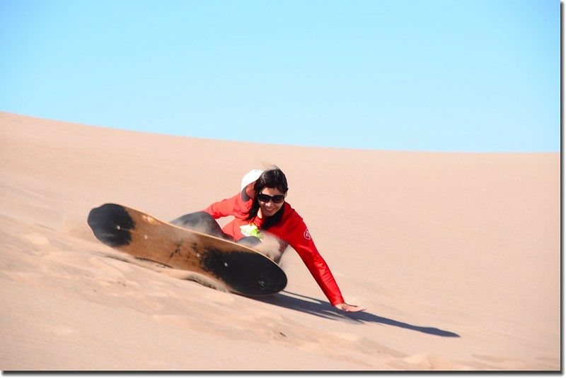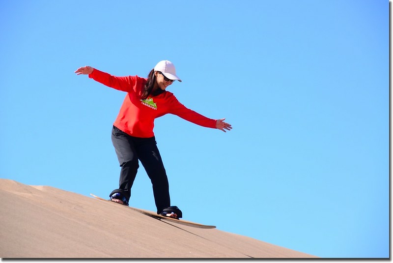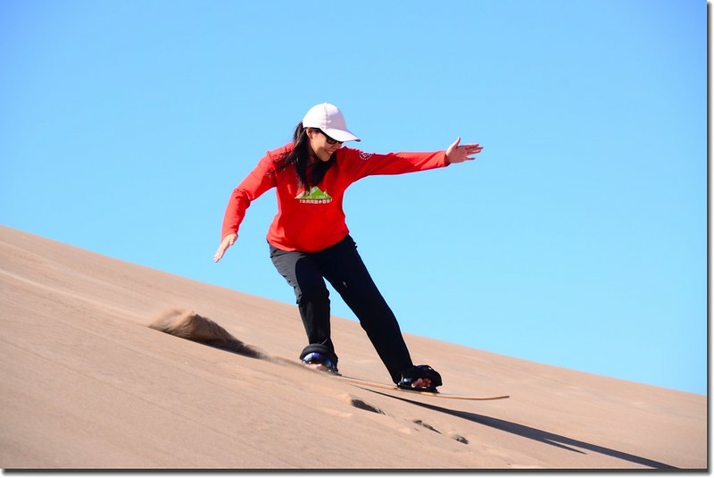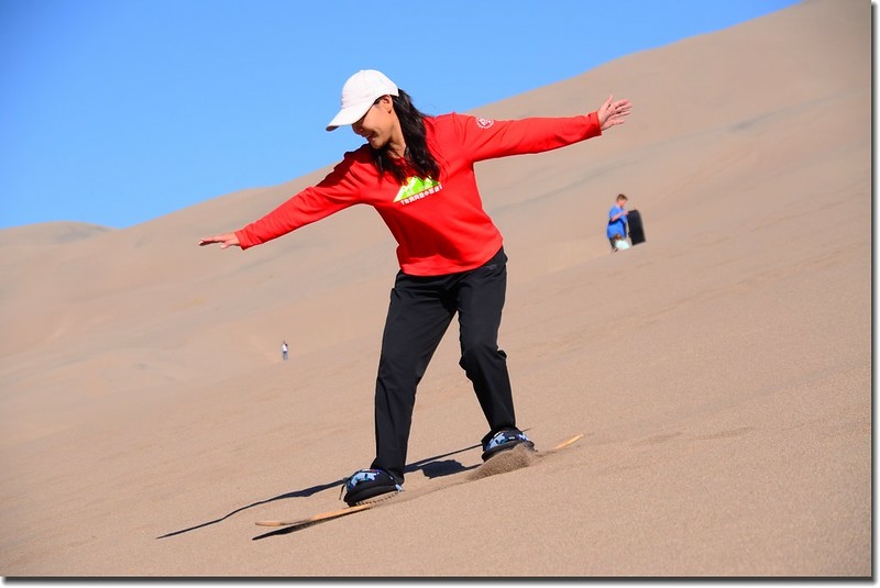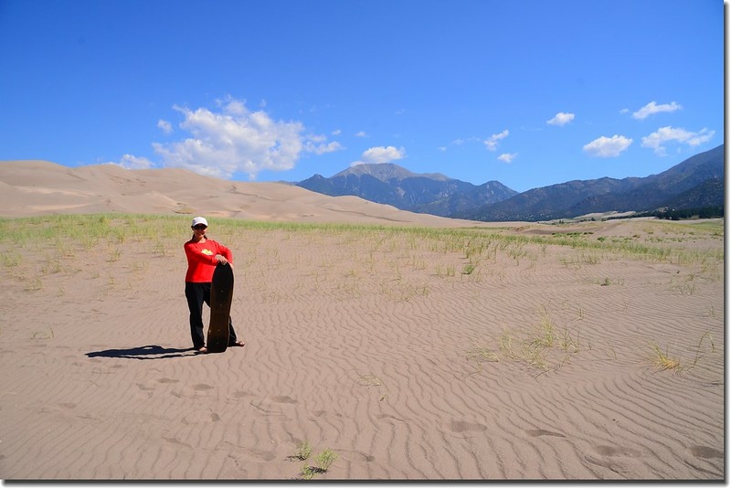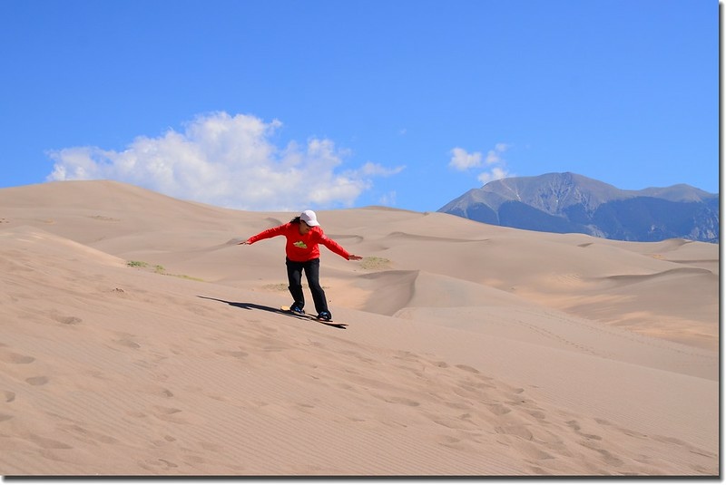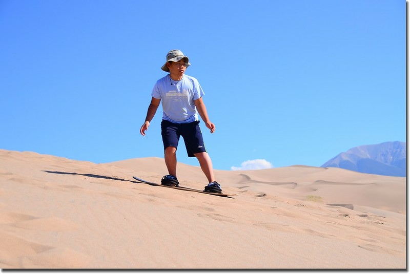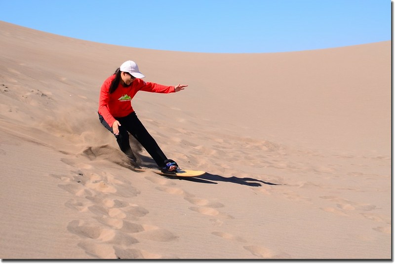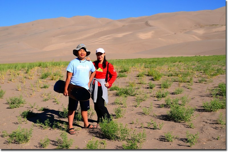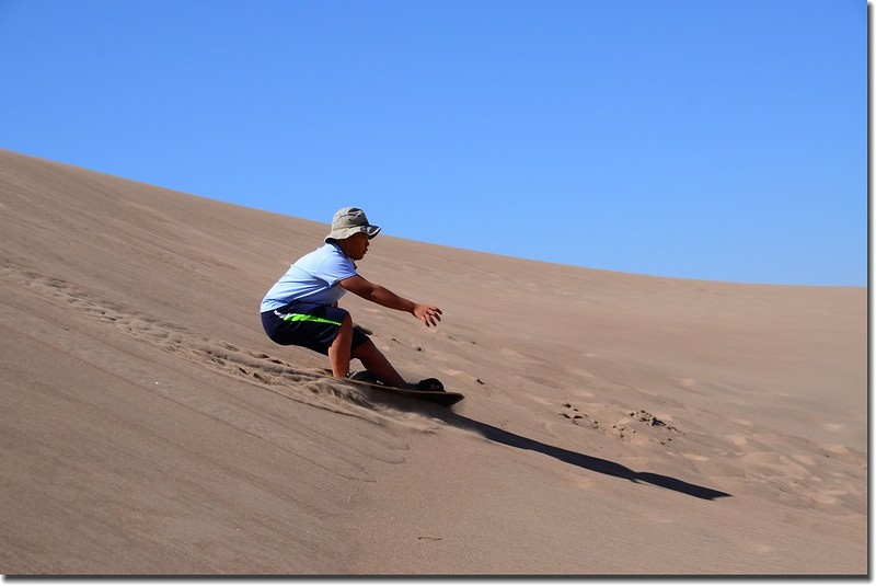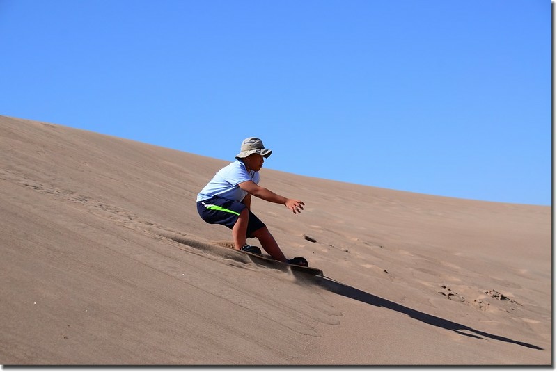 此趟小女兒主要目的是滑沙,所以沒健行;早上欣賞完了日出後大女兒載小女兒到遊客中心外頭約3.5哩CO 150公路邊的Great Sand Dunes Oasis租借滑沙板,一個滑沙板一天20美元,不算便宜,但為了體驗滑沙的樂趣,我們租了一個滑沙板祖孫們輪流體驗,兩個小時下來比健行還累,不過這錢花得也值得!