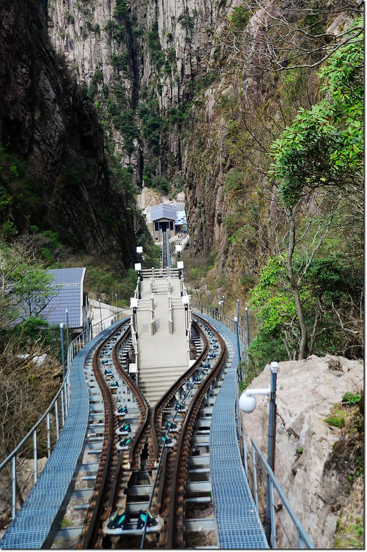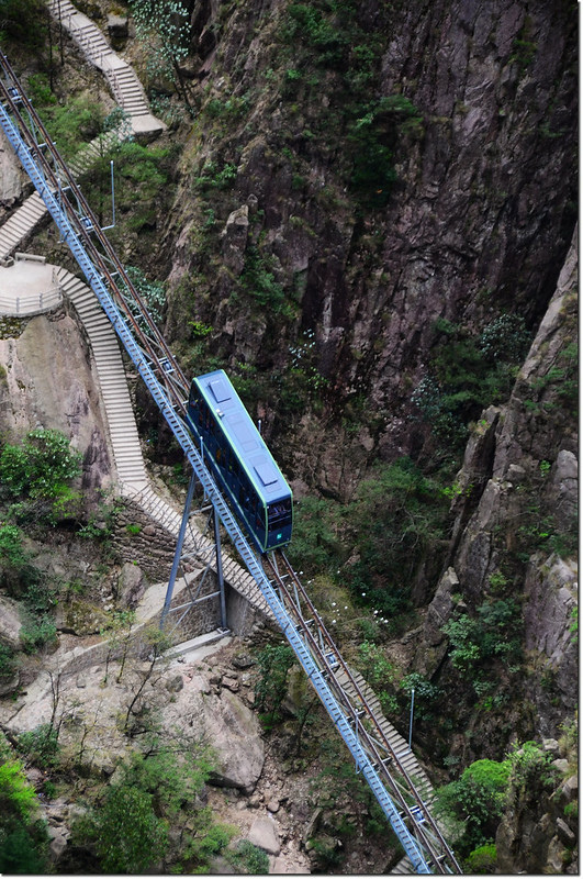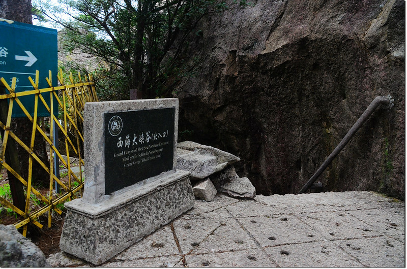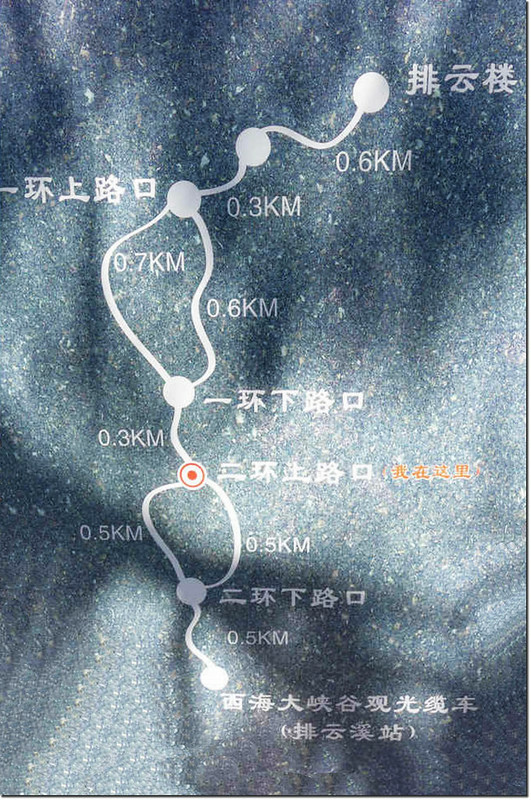 從這裡到谷底,大約是從1600公尺下降到1300公尺,中途有兩個成環狀的步道景點稱為一環和二環;如果遊客下到谷底後循原路回來則可把兩個環道都走完,但一般遊客下到谷底後大都選擇搭纜車上到南入口從白雲賓館出去,如此兩個環道就只能選擇各走一邊的半個環道了,除非你刻意要走完它;小賴建議我們一環道選擇走右邊的路,因為右邊怪石多,二環道才走左邊的路,因為左邊風景較為壯觀。
