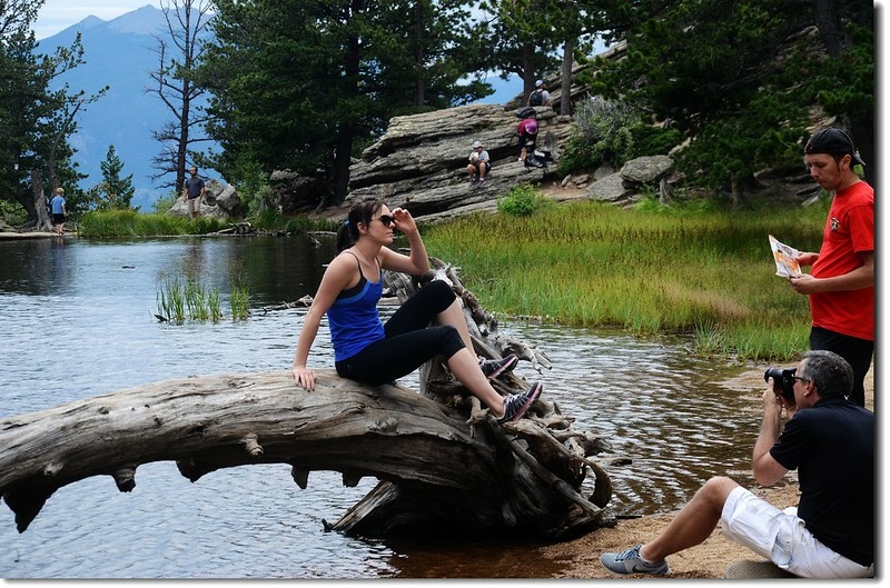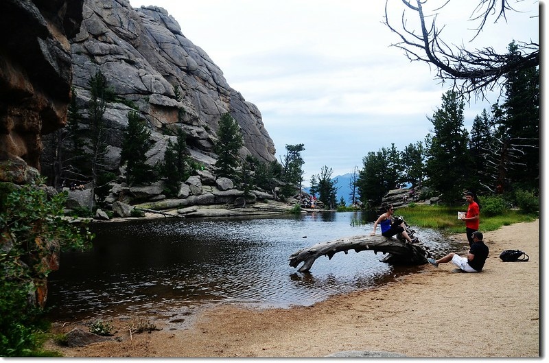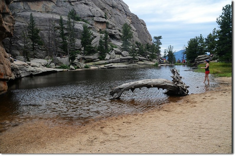 Gem Lake的東岸是一片高牆似的岩石峭壁,西北角是一片沙灘,登山客大多聚集在東岸的岩岸休息用餐,然後到西岸及西北角的沙灘嬉戲,我們在湖邊停留了45分鐘後下山。