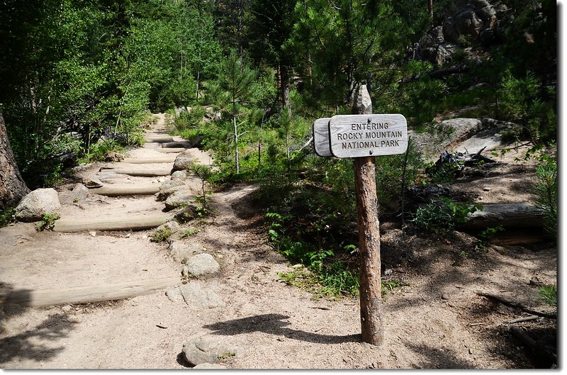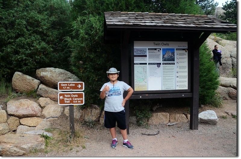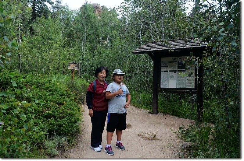 Gem Lake的登山口位在停車場的西北角,此登山口及從Devils Gulch Rd左轉進來的0.3哩的Lumpy Ridge Rd應是近幾年才闢建,因為在2006年第一次登此湖時尚未有這些建築及道路;登山口及登山口設備完善,停車場可停數十部車子,也有完善的廁所。