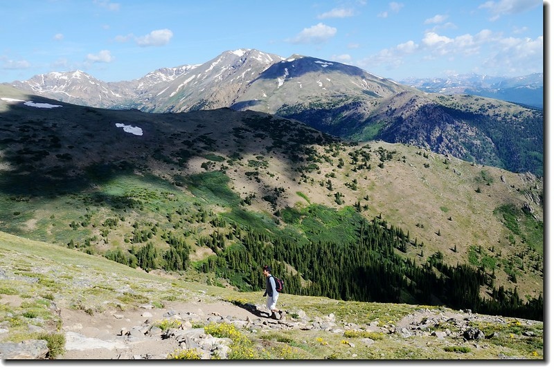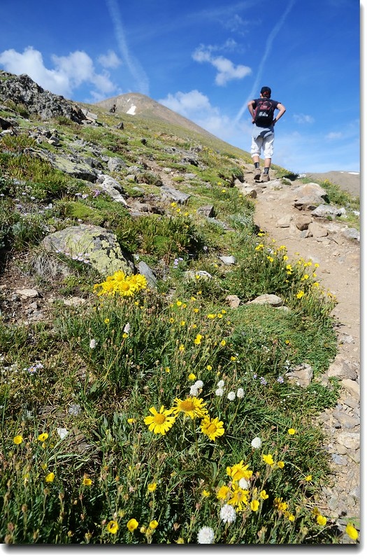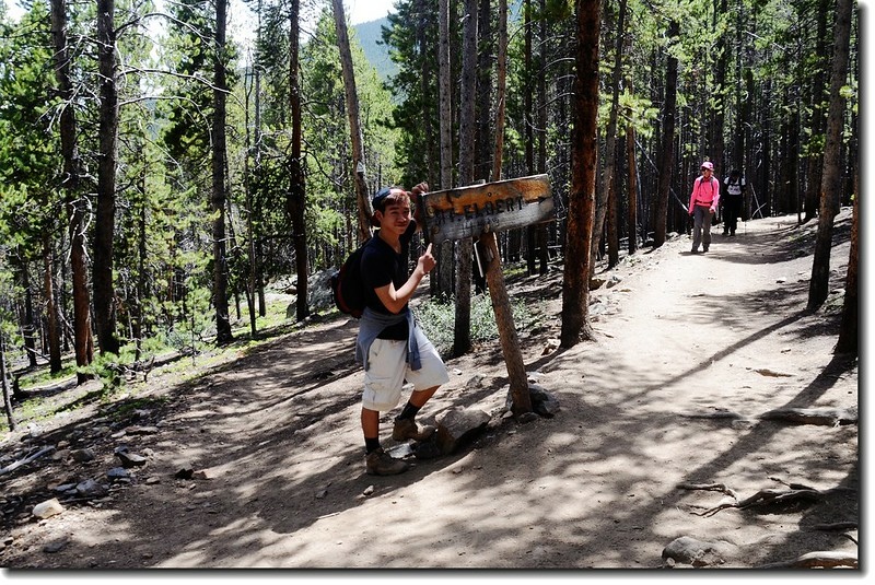 左下Colorado Trail不取,取右直行上山;剛開始步道極為寬大筆直且平緩,路旁Red Columbine及Heart leaved Arnica野花盛開,行不久步道轉為較為狹窄、陡峭在松林間迂迴爬升,我和豆豆開始聽到彼此的喘息聲。