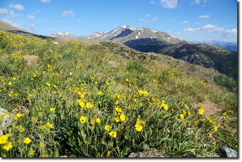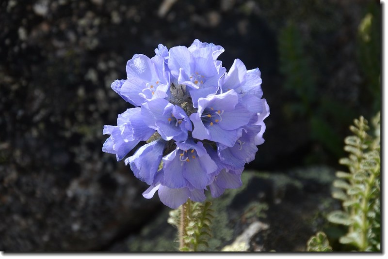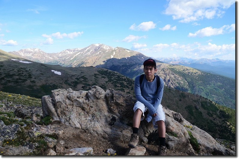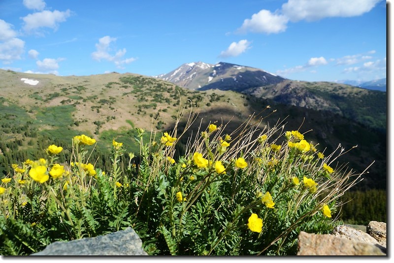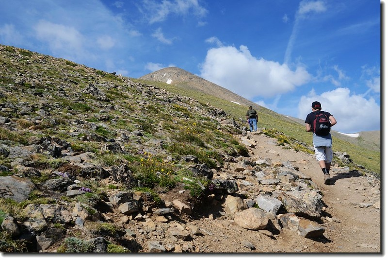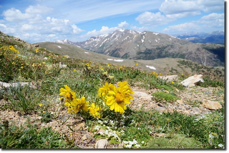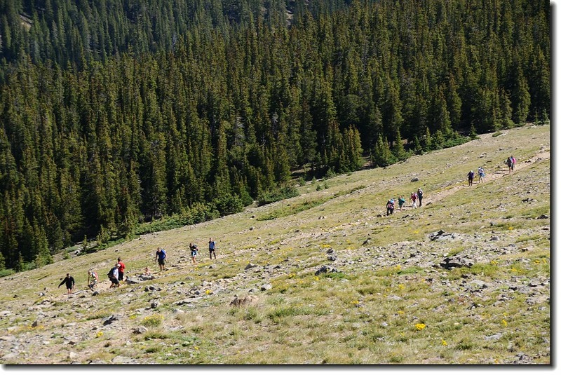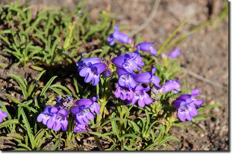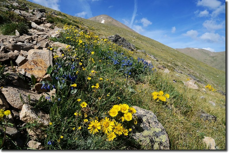 08:15 抵一開闊地,豆豆有點餓,在此小休;此地海拔約11,600呎/3,536公尺,距登山口約2.3哩,空地上野花盛開。