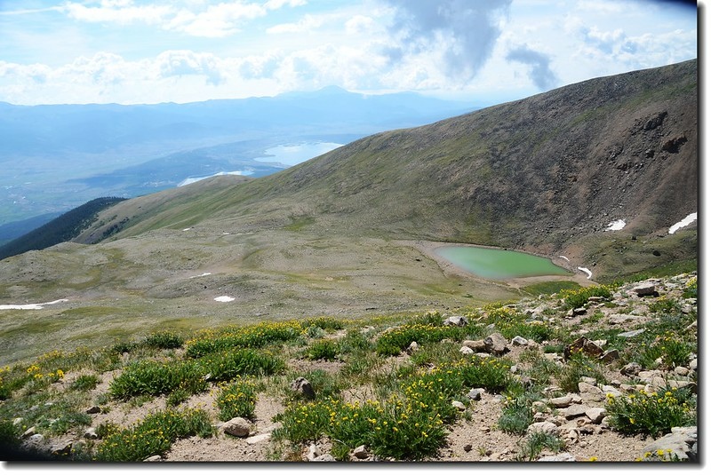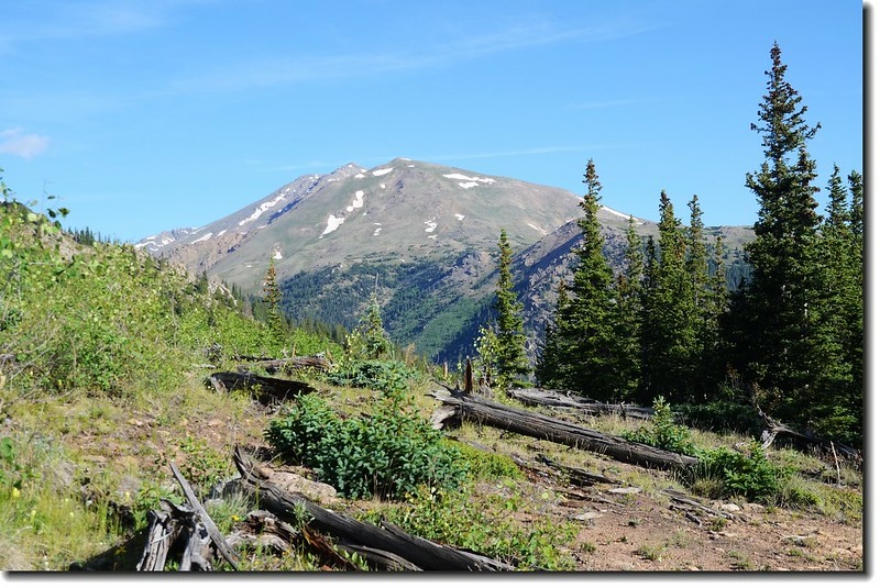 左側下方圓形凹谷有一高山湖,那是Box Creek的源頭,高山湖越稜處山下的Twin Lakes依稀可見;通往山頂的路徑清晰可辨,但此處看不到真正的山頂。