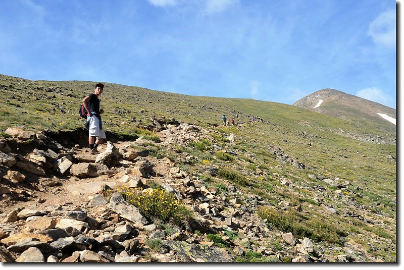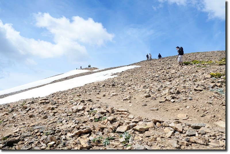 10:40 登上第一個假山頭空曠處,此地海拔約13,900呎/4,237公尺,還有533呎/162公尺的高度要爬升,但在此處還是看不到真正的山頂,剩下的路要比剛才那一段陡坡易走多了!