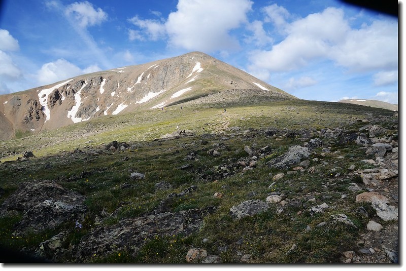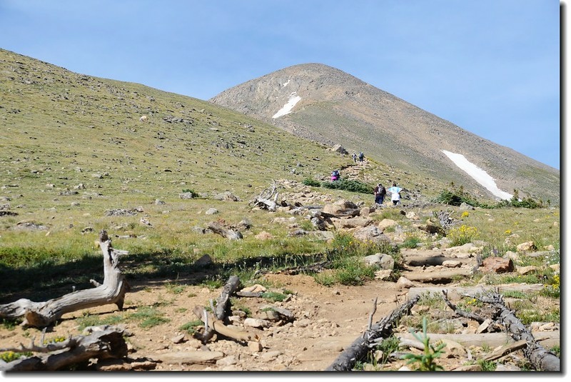 Mount Elbert第一個假山頭矗立在遠方,往後的山徑即要在這看似緩坡其實陡峭的東北稜往上盤升。