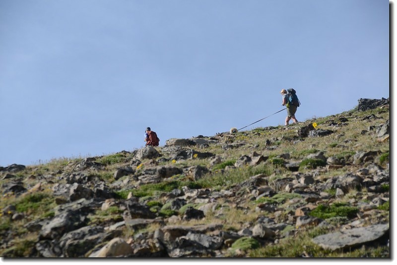 休息5分鐘後繼續上路,豆豆肚子餓了,我們交換背包後讓他先走,交代他登頂後找處shelter避風用餐,我隨後趕到。