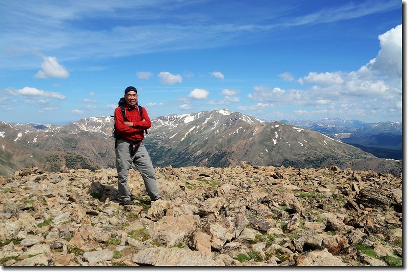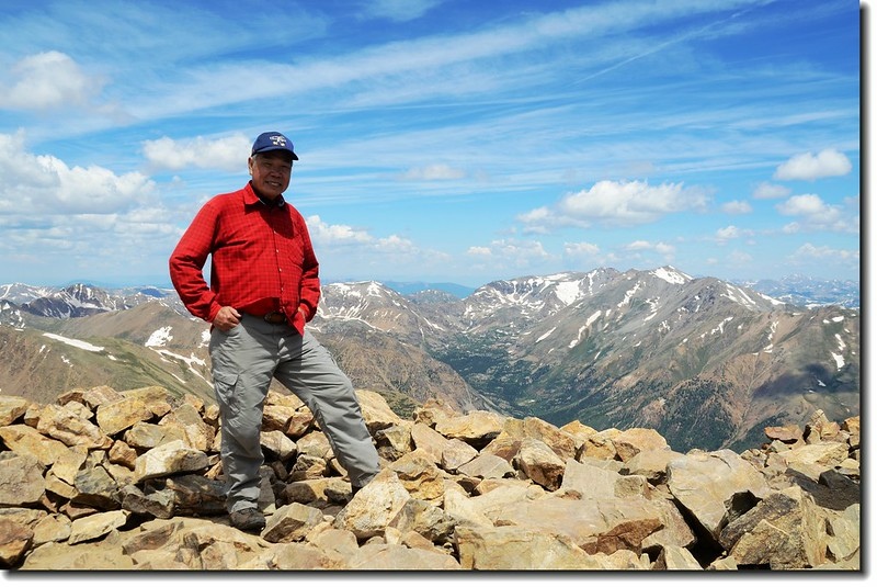 Me on the summit of Mt. Elbert, background is La Plata Peak