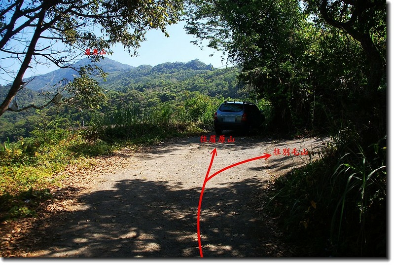 7.2K 遇右岔,電線桿“四號山分71”;此為眉原山、別毛山岔路,海拔約1050公尺,直行眉原山,右岔往別毛山。先取直行往眉原山;