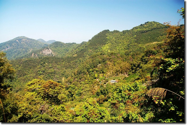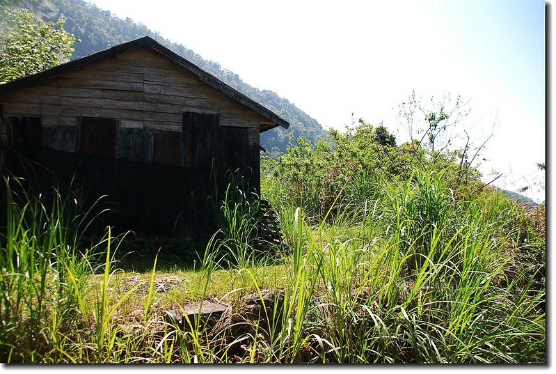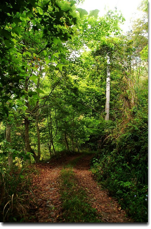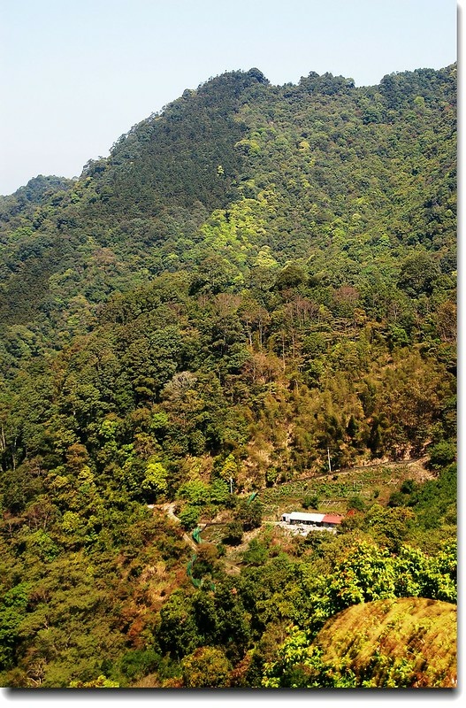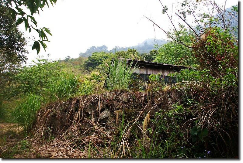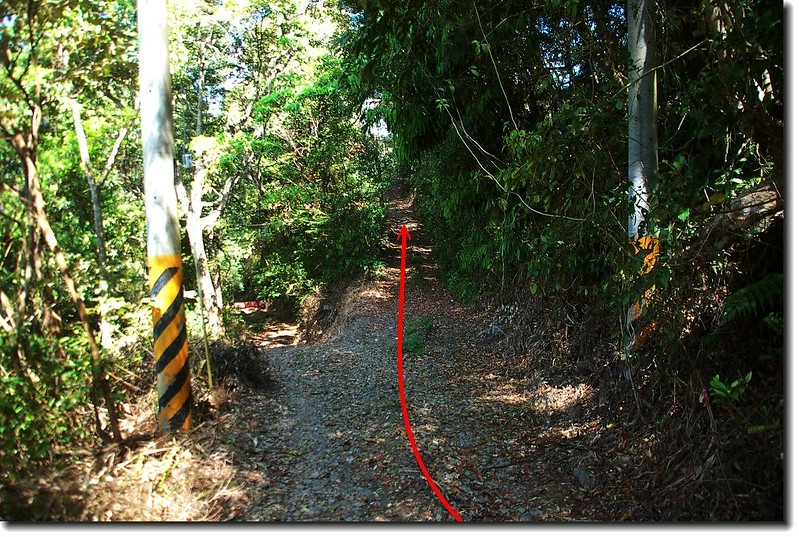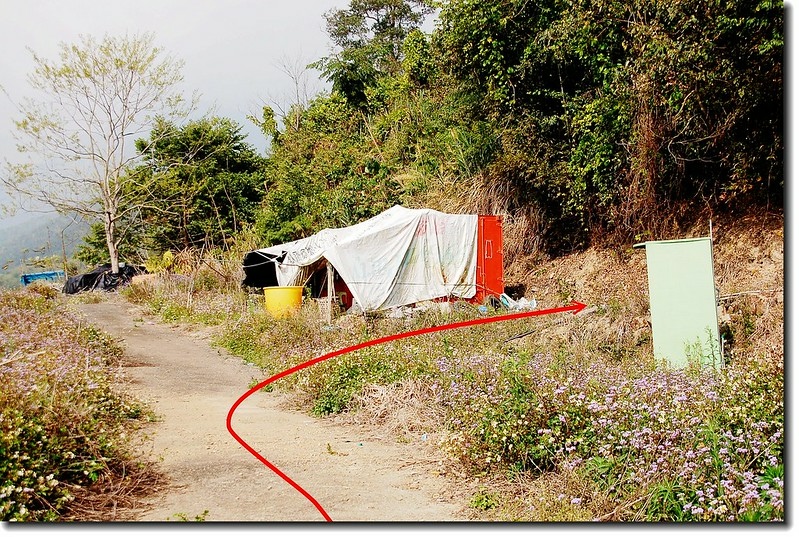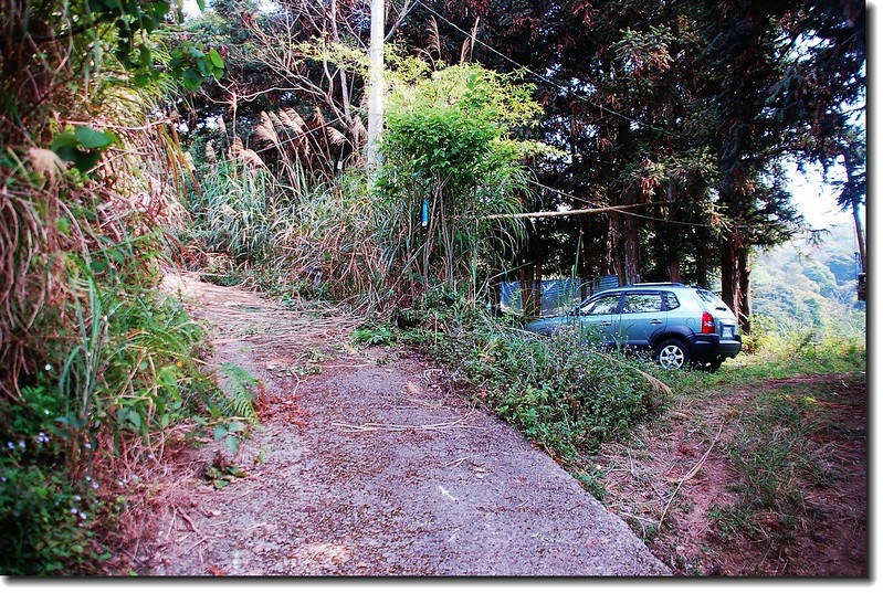 開車回到電線桿“四號山分71”岔路取左上,一路是水泥產道,唯產道兩旁雜樹刮得車子鈑金嘎嘎作響,有點不捨。0.8K後抵道路一鐵鍊上鎖處,路右有一空地及簡易工寮(僅能說是一個棚架吧!),將車停此。