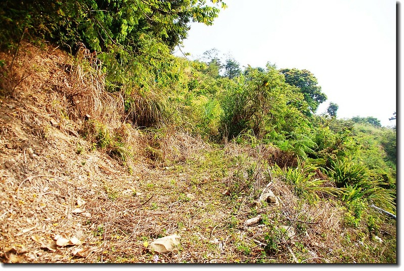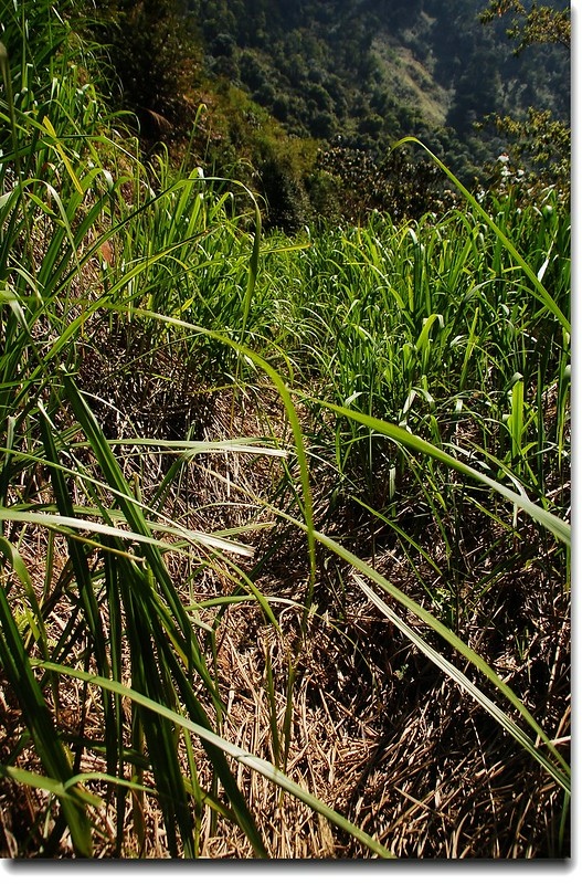 廢產道已被長菅芒草淹沒,稍有路跡;鑽行不久右上切尖芒草山坡,一路皆在菅芒草中循著稀疏的路條上行。
