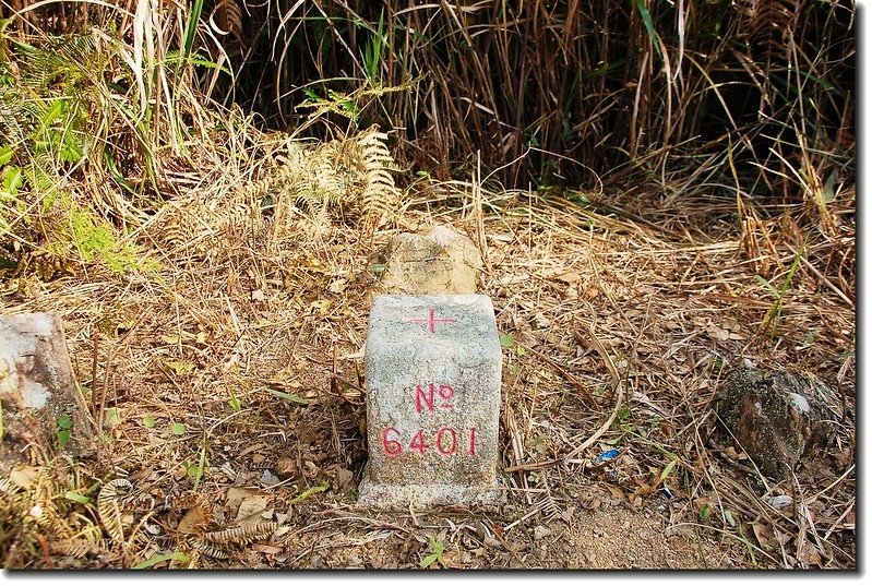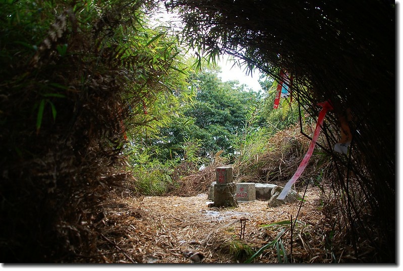 12:43 登頂眉原山,標高1785公尺,山頂立有一顆編號6407號的三等三角點和一顆山字森林三角點,三等點後的護石可能是此點的基盤吧?上頭有個紅色“+”記號;山頂四周是箭竹和雜樹林,毫無展望。