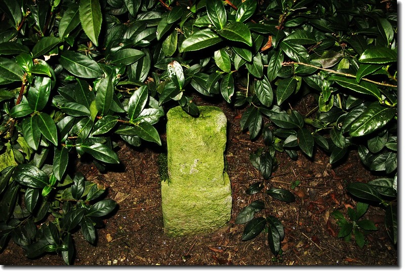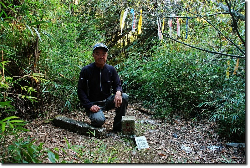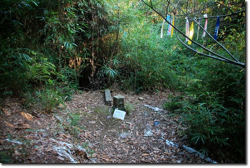 循指標進入茶園在一棵小櫻花樹下找到南東眼山南峰森林三角點,基石隱藏在茶樹下不太好找,還好基點旁櫻花樹上綁有兩三條路條。