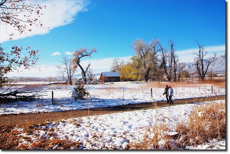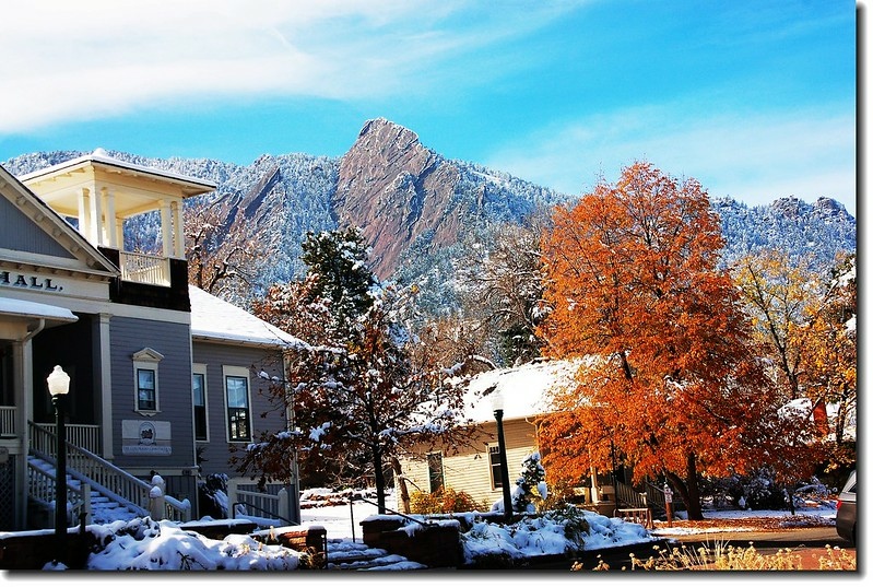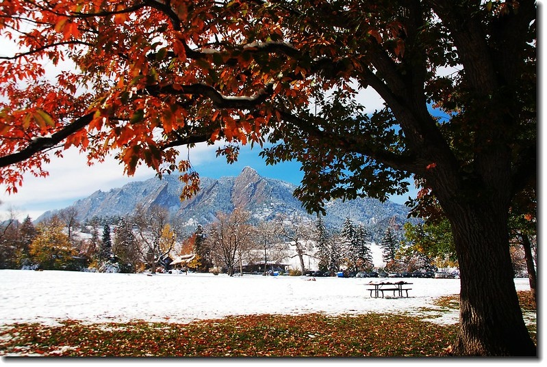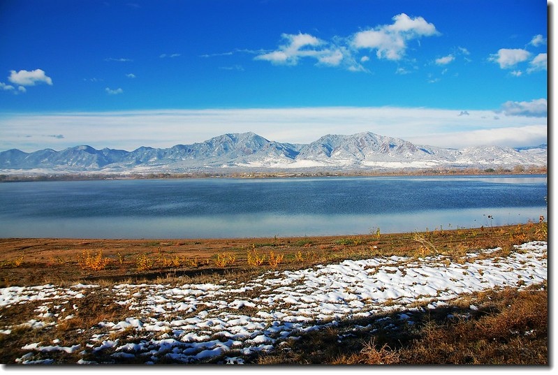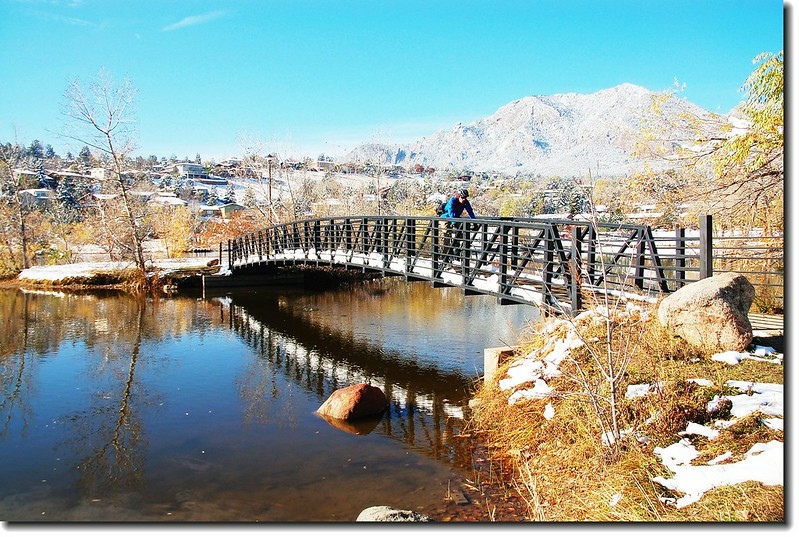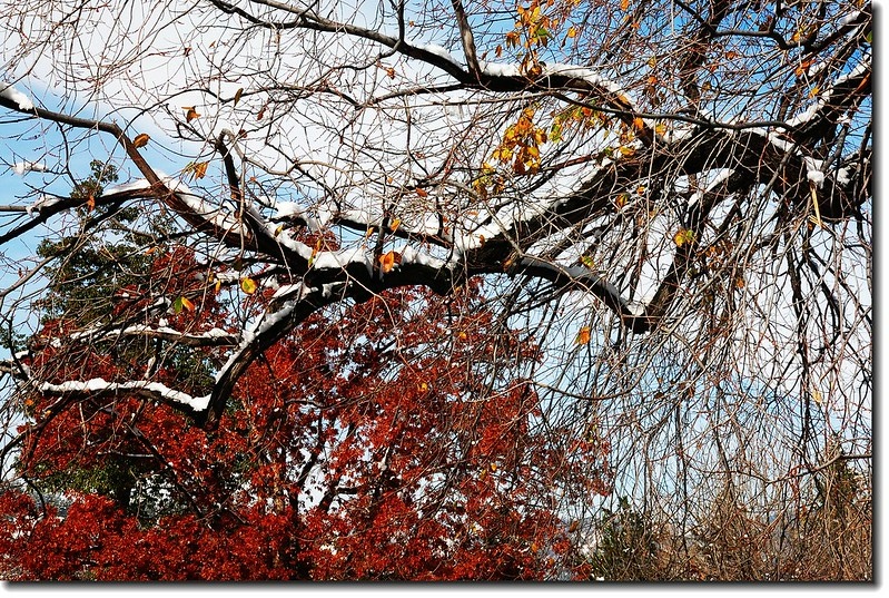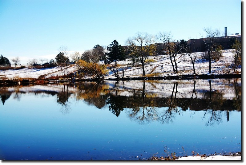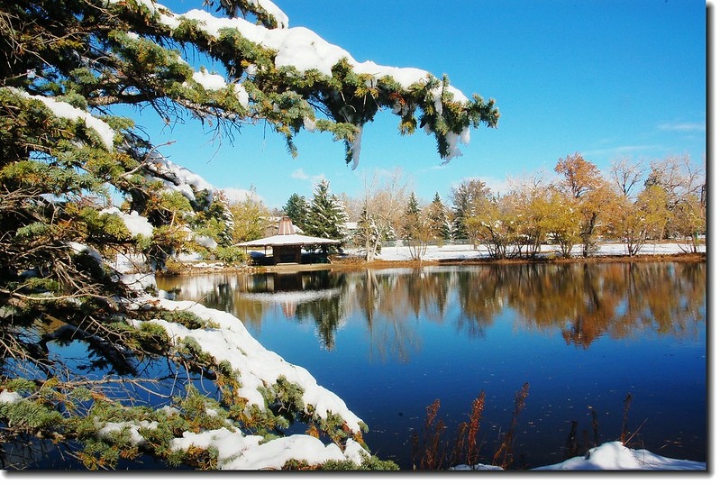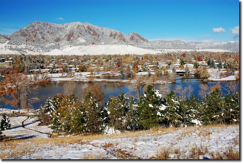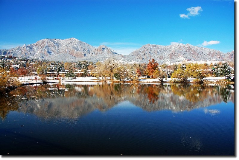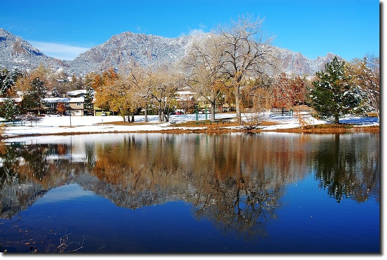 二十四、二十五日晚上各下一場雪後,週六(27)剛好是個大晴天,獨自一人到山城Boulder走走。比起前天剛下雪來訪時的雲蒸霧湧、朦朦朧朧,今天則是晴空萬里、湛湛藍天;大地舖上一層靄靄白雪,掉光葉子的禿樹傲佇雪地,天氣好,蟄伏幾天的人群也活躍了,湖邊、雪地,盡是賞雪、玩雪的人群。冬,已悄悄來到人間!