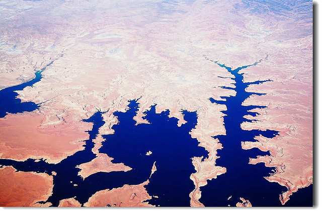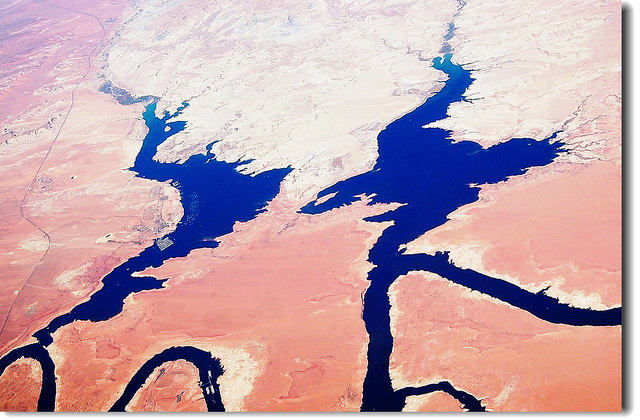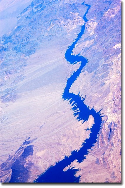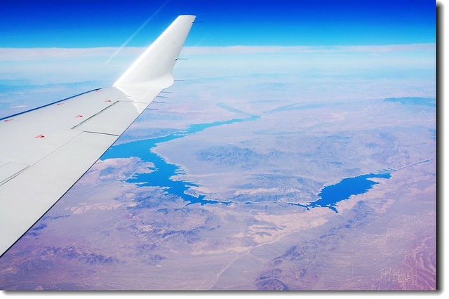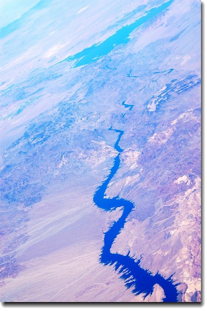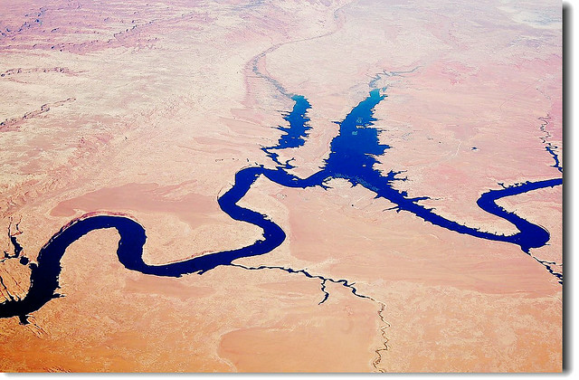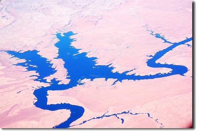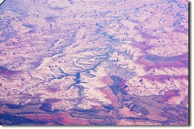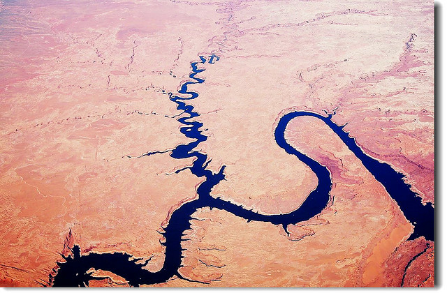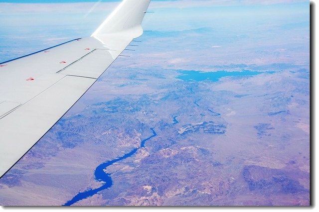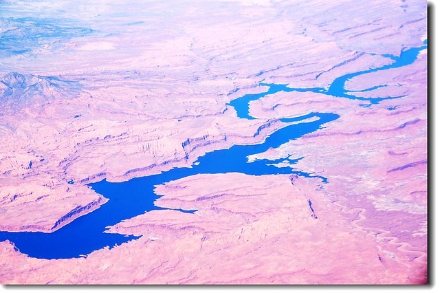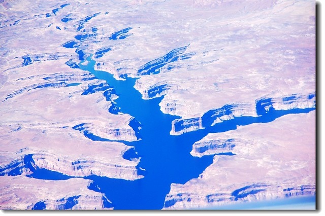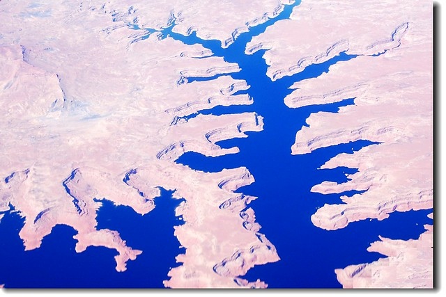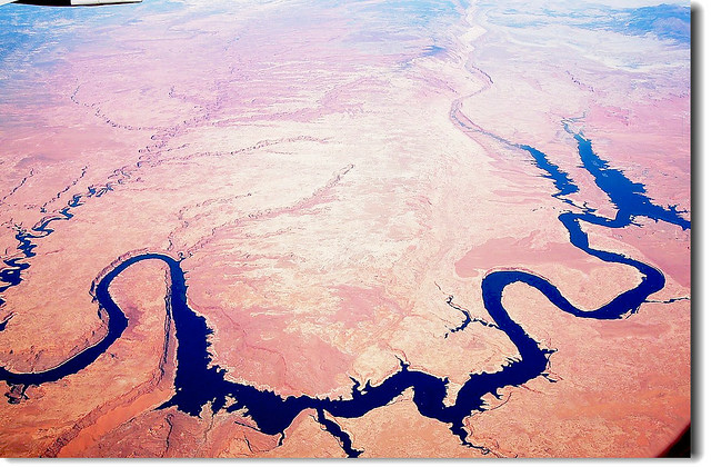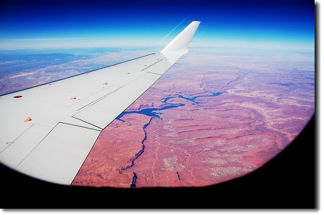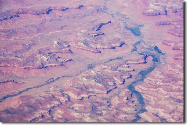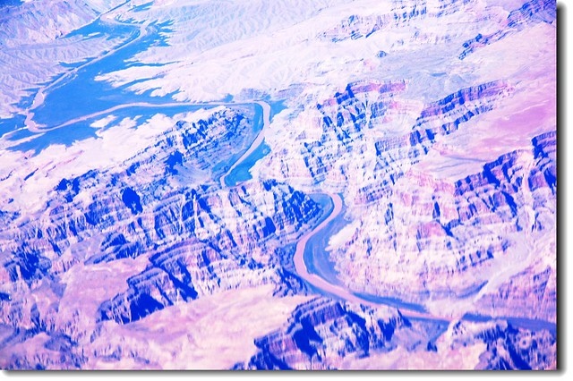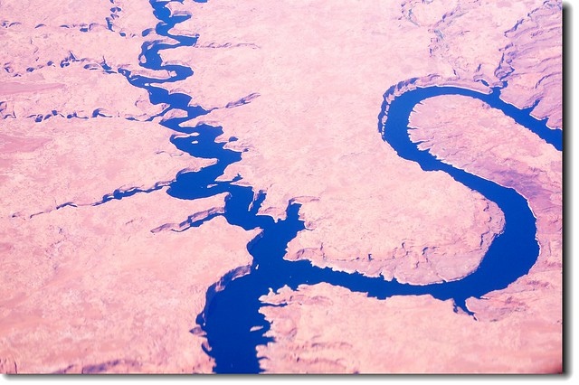 飛機進入猶他州和亞利桑那州後,委蛇蜿蜒的科羅拉多河川穿過紅色砂岩地質,形成大峽谷等壯觀的切割河谷,此後一路大江“西”去、南下直抵加利福尼亞灣。