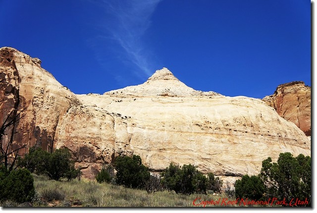 “Capitol”是指公園內有一座類似美國國會圓頂大廈的白色圓頂大石山-- Capitol Dome(Navajo Dome);