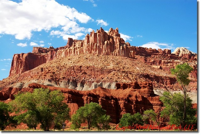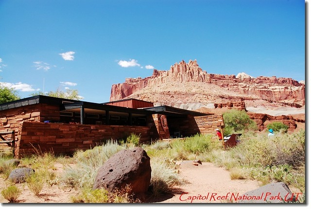 The Castle城堡巨岩是最醒目地標,對面是Capitol Reef遊客中心。