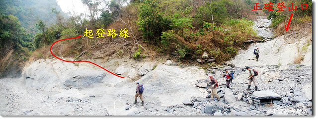 07:48 來到登山口,阿超在偏東一處小支流口張望,我們則在偏西數十公尺的稜尾發現一條小徑,取稜尾小徑上攀,這一走,多繞了約四、五十分鐘,回程時才發現阿超在張望的小支流口右側才是正確登山口。