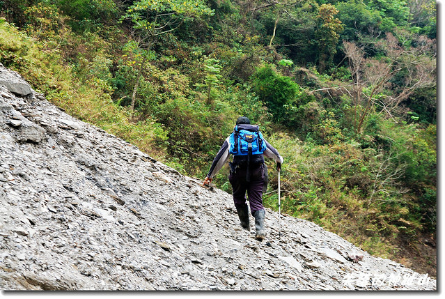 17:28 下抵09:10的山谷,山哥要大家備好頭燈後隨即下山;我們發現西岸有一處岩壁上鑿兩處踏腳點,岩壁下有疊幾塊大石似為墊腳用,推測有人走過,捨去早上來時路,由此上攀。此後是一路明顯小徑,先穿過一處崩塌處下方,隨即循稜而下。