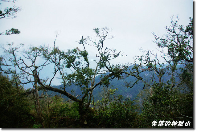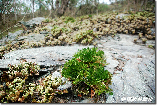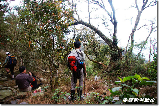 12:53 路過柯藝隊稱的“小神木”,此後山徑不很明確,陡峭、濕滑,腳底下盡是一片一片的頁岩,地面上長滿冷清草;走三步、退兩步,腳下無踏點、手上無抓力物,苦呀!這段路。