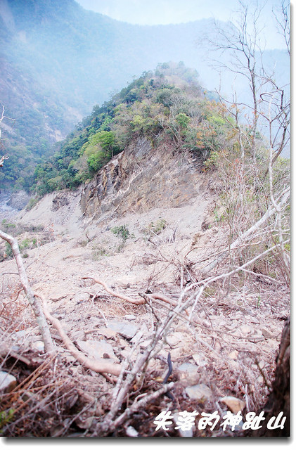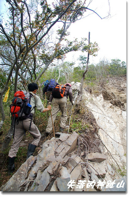 13:59 來到神趾山頭,只見山頭東北面一大片大崩壁,就像是哪個巨靈把這座南北長達一、兩百公尺的山頭從中劈成兩半;三角點呢?三角點呢?一陣疑惑的驚呼聲,Kaku和阿超忙著用GPS抓座標。