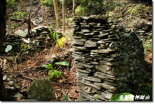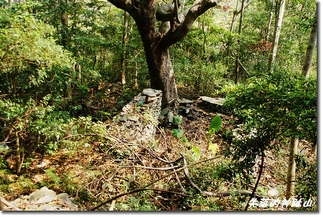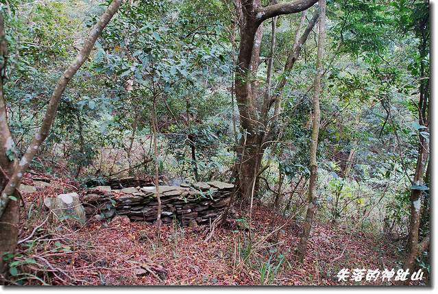 07:50 取左側一條小徑起登,該線沿著小稜線上升,此小徑明顯是取水小徑,一路是村民的引水管,途中多處石板駁坎、石版屋遺址。
