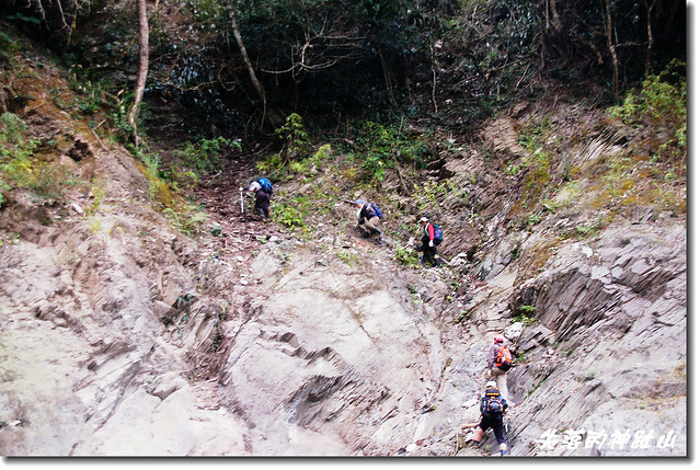 11:57 行程有點延遲,吃過中餐即刻上路;由河谷小瀑左下不遠處上切,上切約10分鐘上到一小稜線,隨即右轉循稜而上,一路不甚好走,陡、路徑不易辨識。