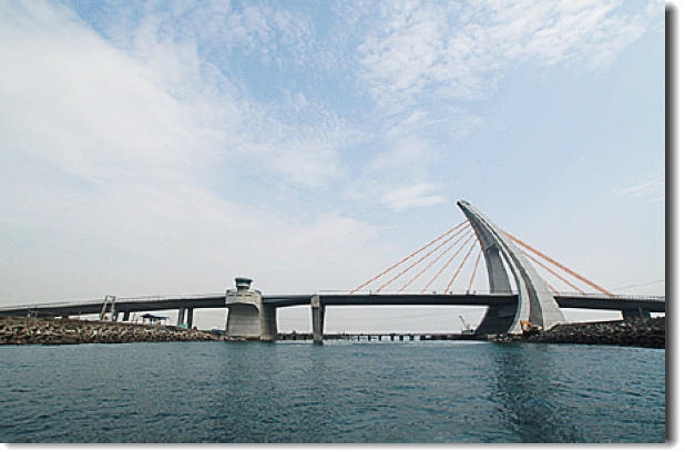 鵬灣跨海大橋最特殊之設計在於活動橋面只需2分鐘,即可開啟75度仰角,跨距達20公尺,以方便大型帆船進出,巍峨矗立於大鵬灣出海口之上的鵬灣跨海大橋,不僅將成為東港地區的新地標,而總工程款達新台幣40.51億元的大鵬灣環灣道路全長12.3km,共分為CH01標至CH04標分段施工,97年2月起陸續完工通車,最後階段、也是最重要的CH02標1400公尺路段,終於大功告成,宣告環灣道路全線通車,更將大鵬灣與週遭地區未來觀光發展緊密串連起來,未來配合BOT遊艇港開發建設,進一步與高雄愛河觀光碼頭及小琉球離島串聯形成「港、灣、島」新三角旅遊地帶,帶動大鵬灣成為國際級水上船舶活動渡假勝地。