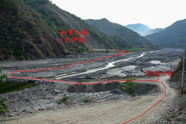 台1線南下431.71K處左轉屏132線,向東往七佳部落東行,過了力里村後不久來到遭莫拉克颱風大水沖斷的白鷺大橋處,