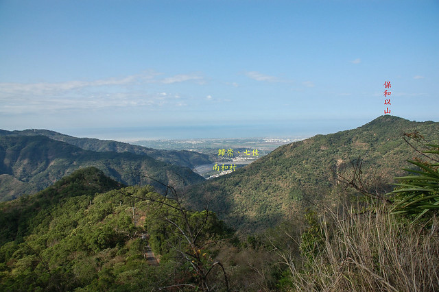 鞍部東側一條小徑是通往南久保山,樹上標示路程約80分鐘,四年前登此山時來、回各花一小時。欲爬此山先從鞍部往東開始陡坡爬升約50公尺,之後一路緩降至三角點。南久保山是久保山尾稜上的山頭,標高1160公尺 ,山頭有一顆三等三角點,編號6645號,山頭有部份展望。