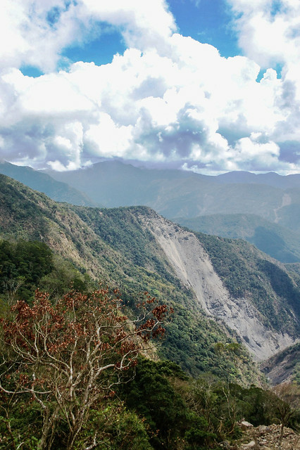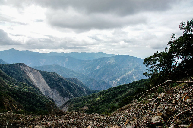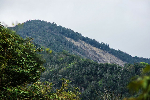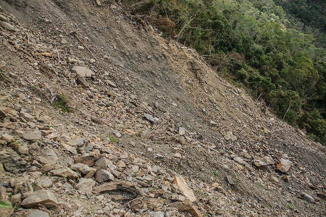 09:47 遇到一處大崩壁(寬約百公尺),應是八八的傑作,仔細看對面綁有布條就是銜接點,先下切到較底端再上切到銜接點接回原登山小徑。