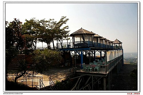 11:55 308高地,草山月世界土雞城(創始店—左鎮洪代表始創)。土雞城之高點有一顆大林尾山的三等三角點,編號541號,海拔 308 公尺。