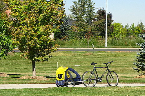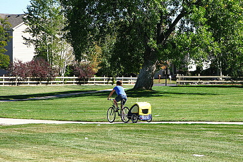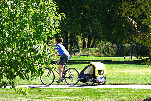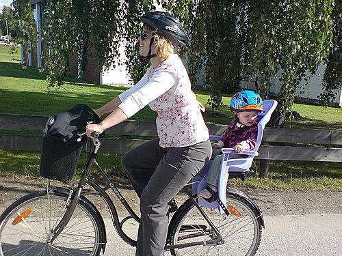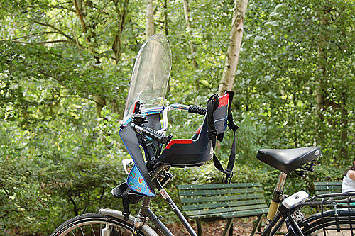 前一陣子油價飆漲,引起節能減碳的危機意識,加上各地方政府的普設自行車專用道,騎自行車幾乎成了全民運動。在國內偶而看到父母帶著小孩在愛河邊騎自行車的溫馨場面,但是還沒有能力騎車的小孩怎麼辦?只能這樣了!